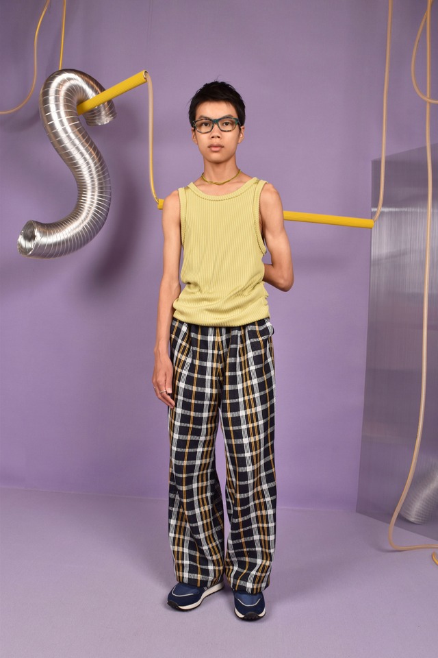 珍しいチェック柄のコットンメッシュ生地を使用したイージーパンツです。ベルトループ、両サイドにシームポケットがあります。メッシュ生地なので通気性抜群な上、コットン素材なので吸湿性もあり快適に着用頂けます。膝上丈の裏地付きなので下着が透けません。ユニセックスです。共地のジャケット、ガウンとのセットアップもおすすめです! 着用:168cm男性 color:NY×YE CHE size: F ウエスト76-94cm 股上36cm 股下72cm わたり36cm 裾幅26cm material: cotton100%