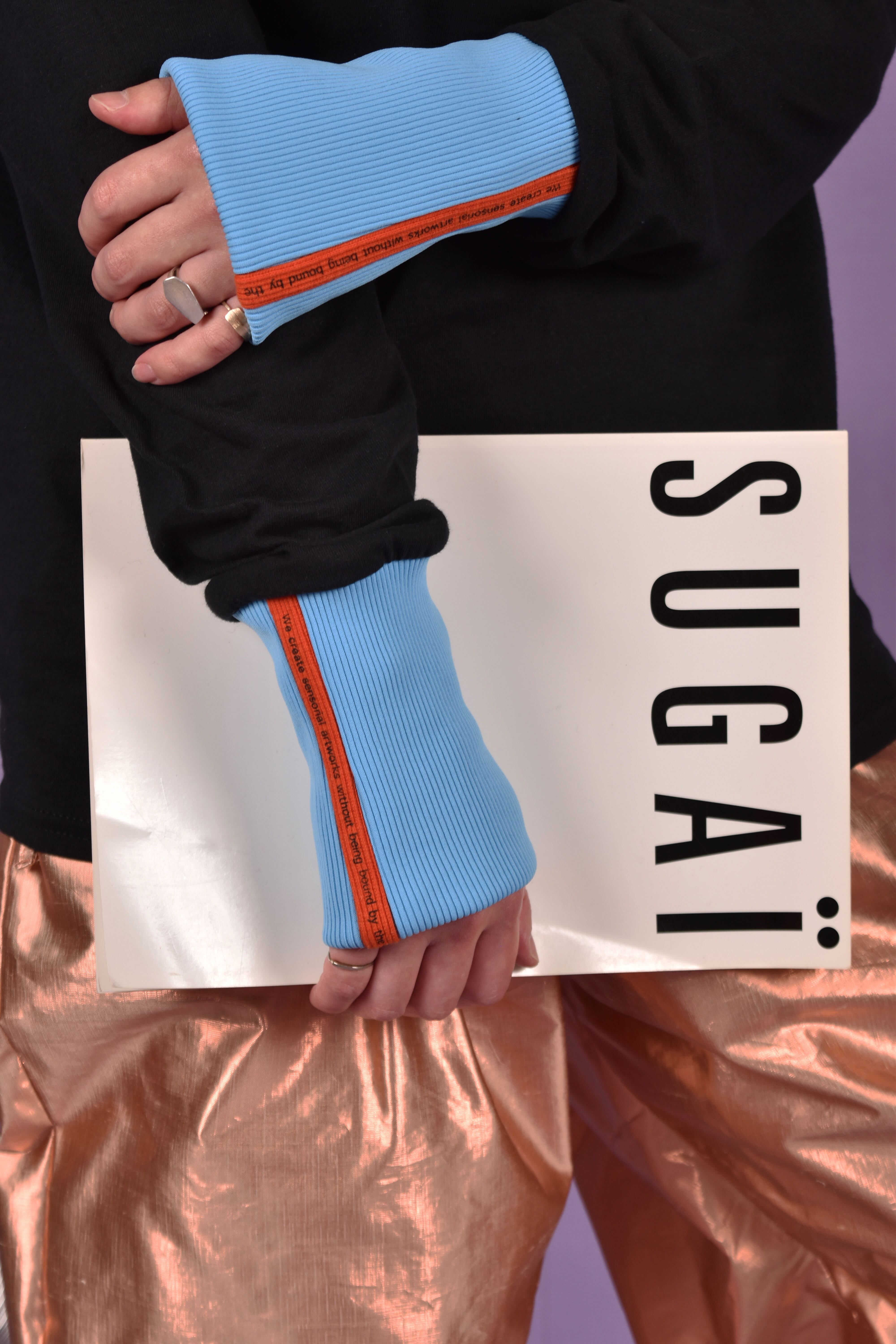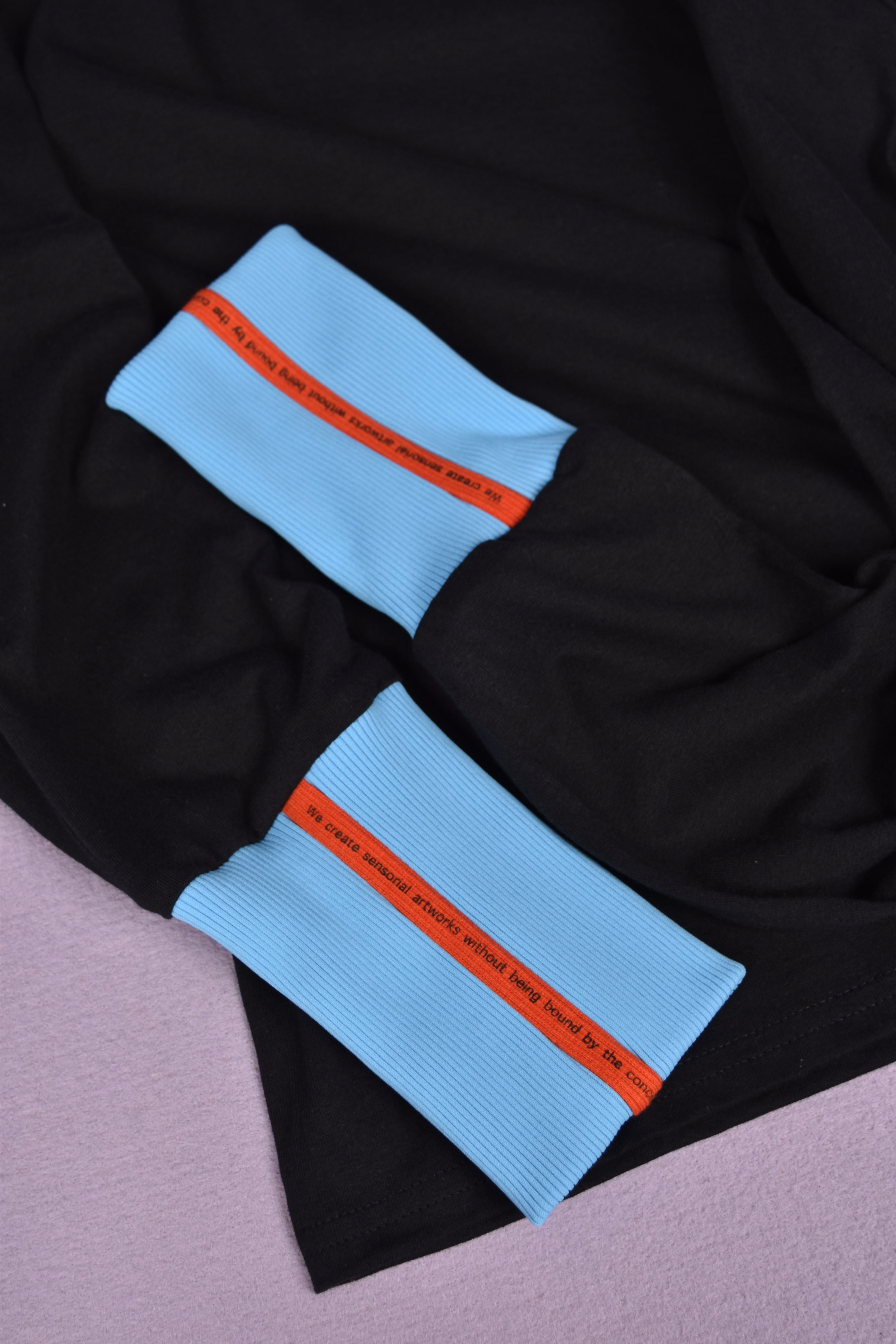 ODD L/S TEEは一般的にプリントTEEなどで使用されるようなUSAメーカーのボディを敢えて使用し、その袖リブをカット、全国からコツコツと集めた特徴的なスパンテレコ生地を使ってオリジナルのリブを製作し組み合わせました。通常の袖リブの2倍以上の長さとし全体のバランスを崩しました。
