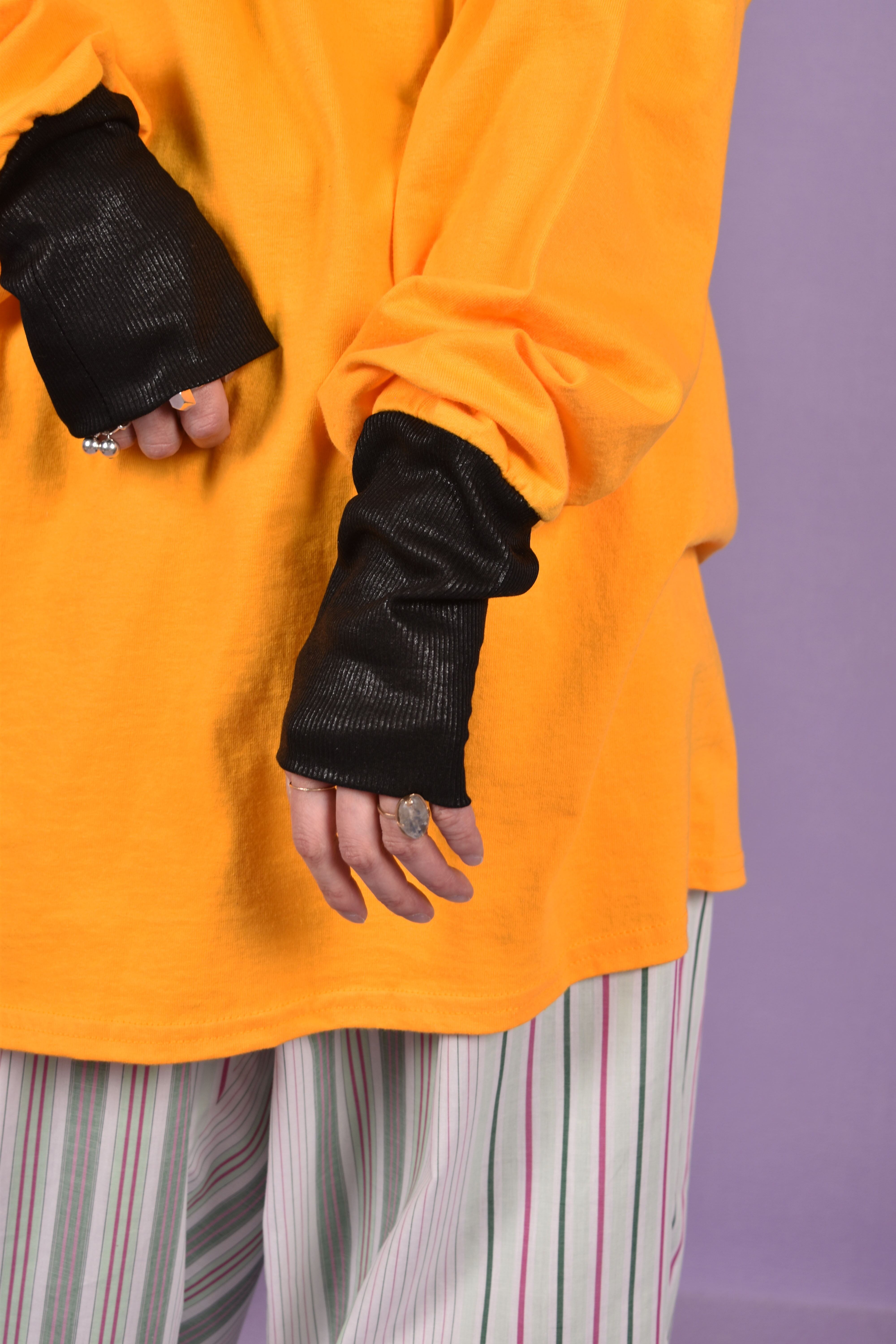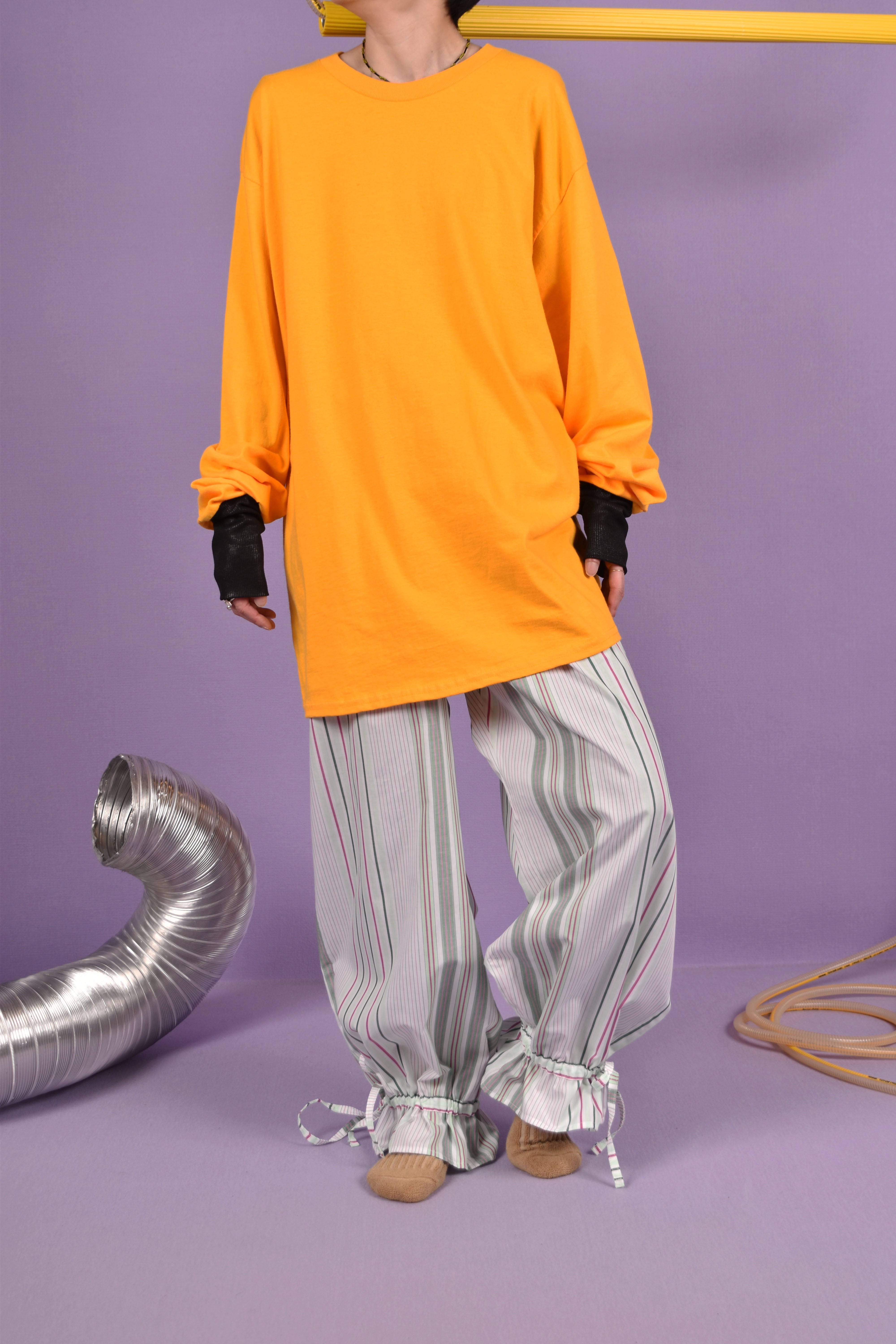 ODD L/S TEEは一般的にプリントTEEなどで使用されるようなUSAメーカーのボディを敢えて使用し、その袖リブをカット、全国からコツコツと集めた特徴的なスパンテレコ生地を使ってオリジナルのリブを製作し組み合わせました。通常の袖リブの2倍以上の長さとし全体のバランスを崩しました。