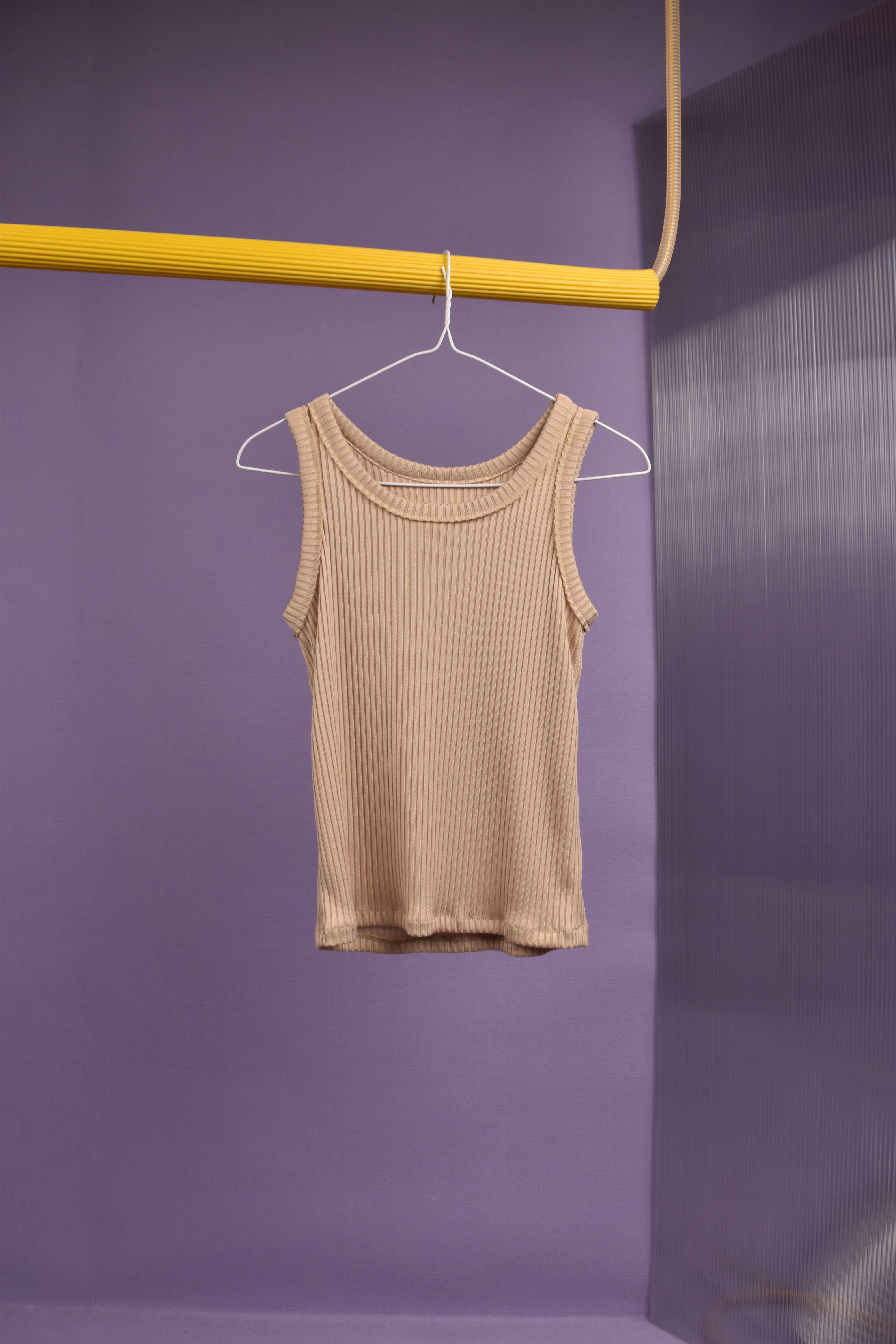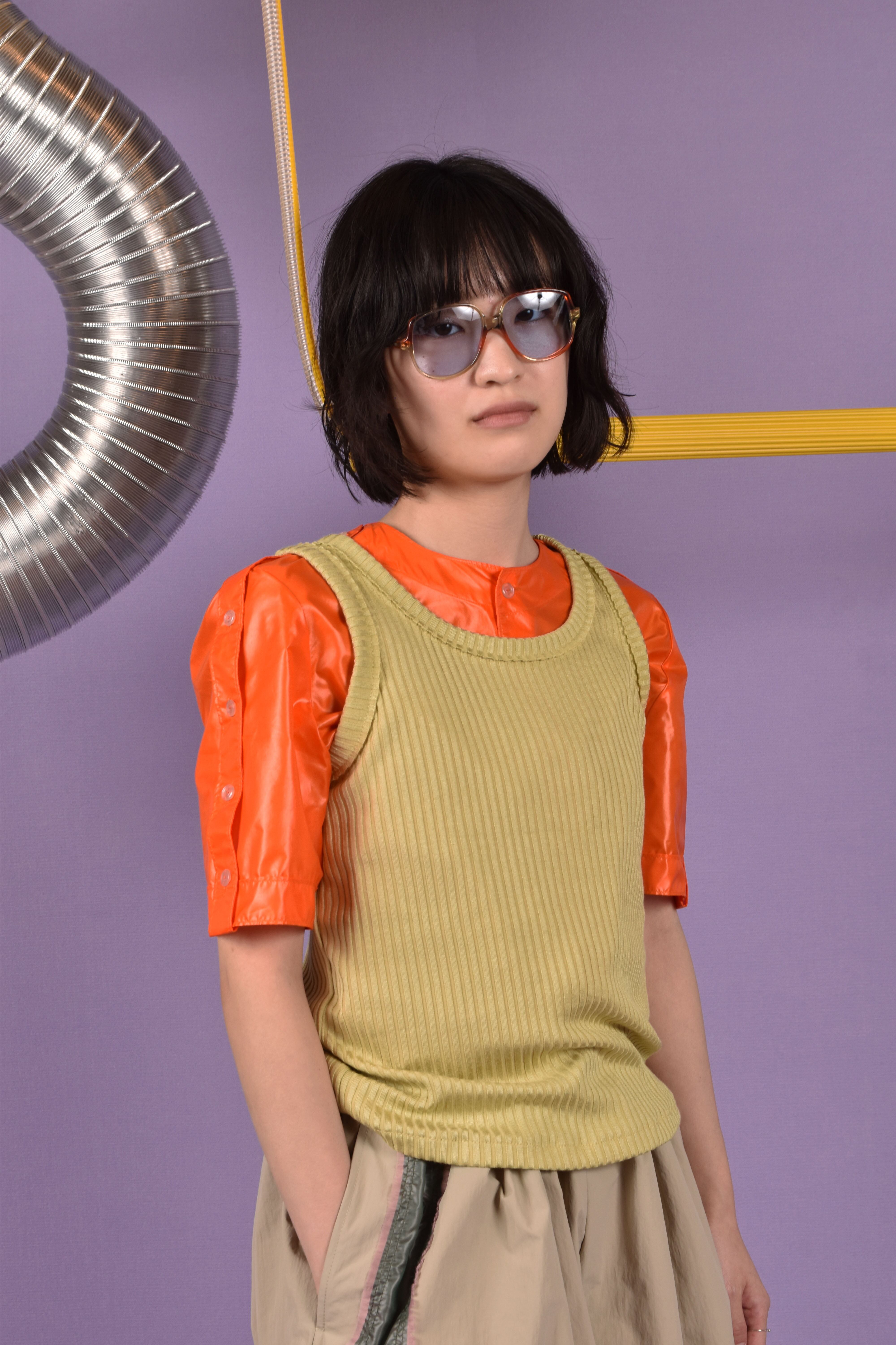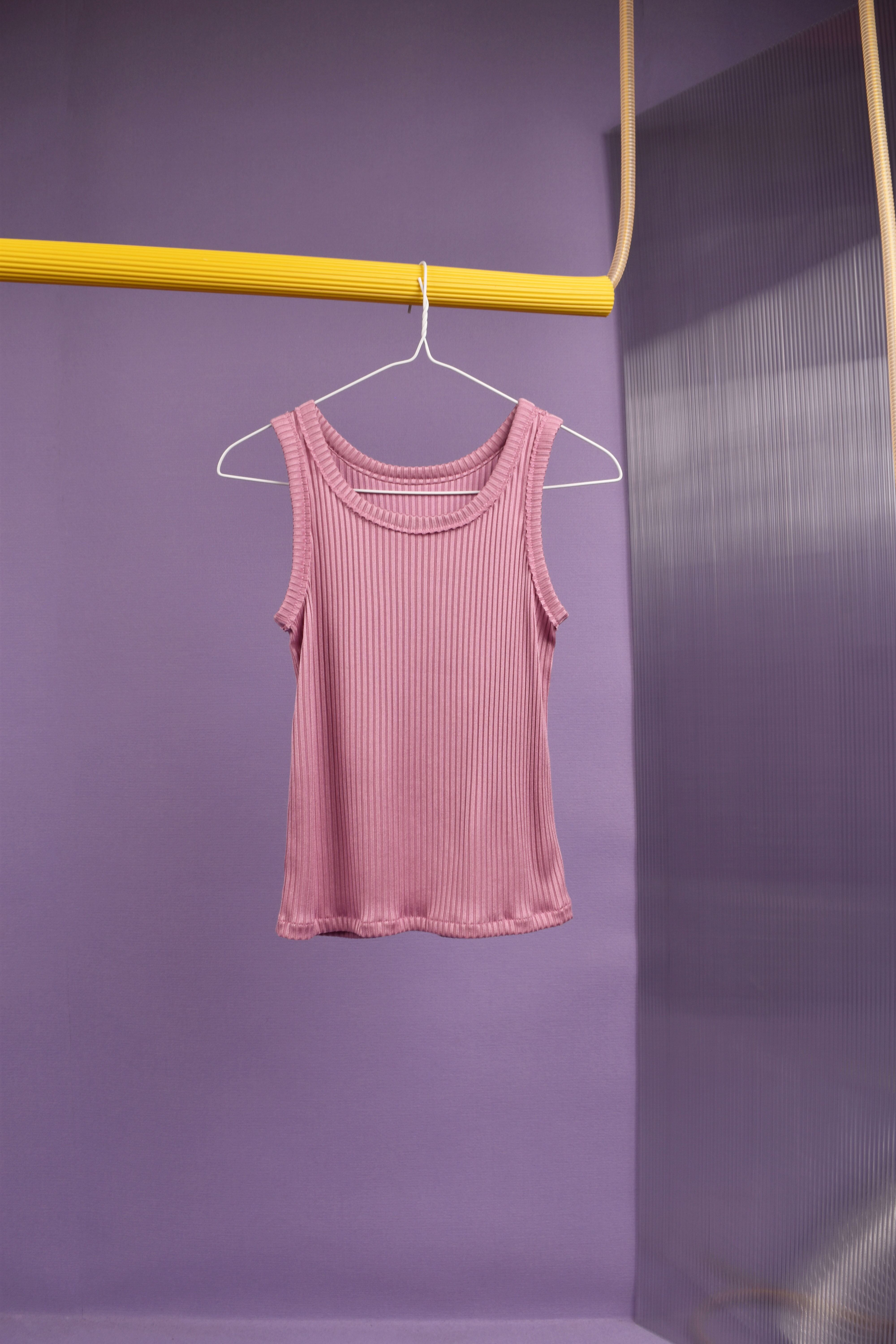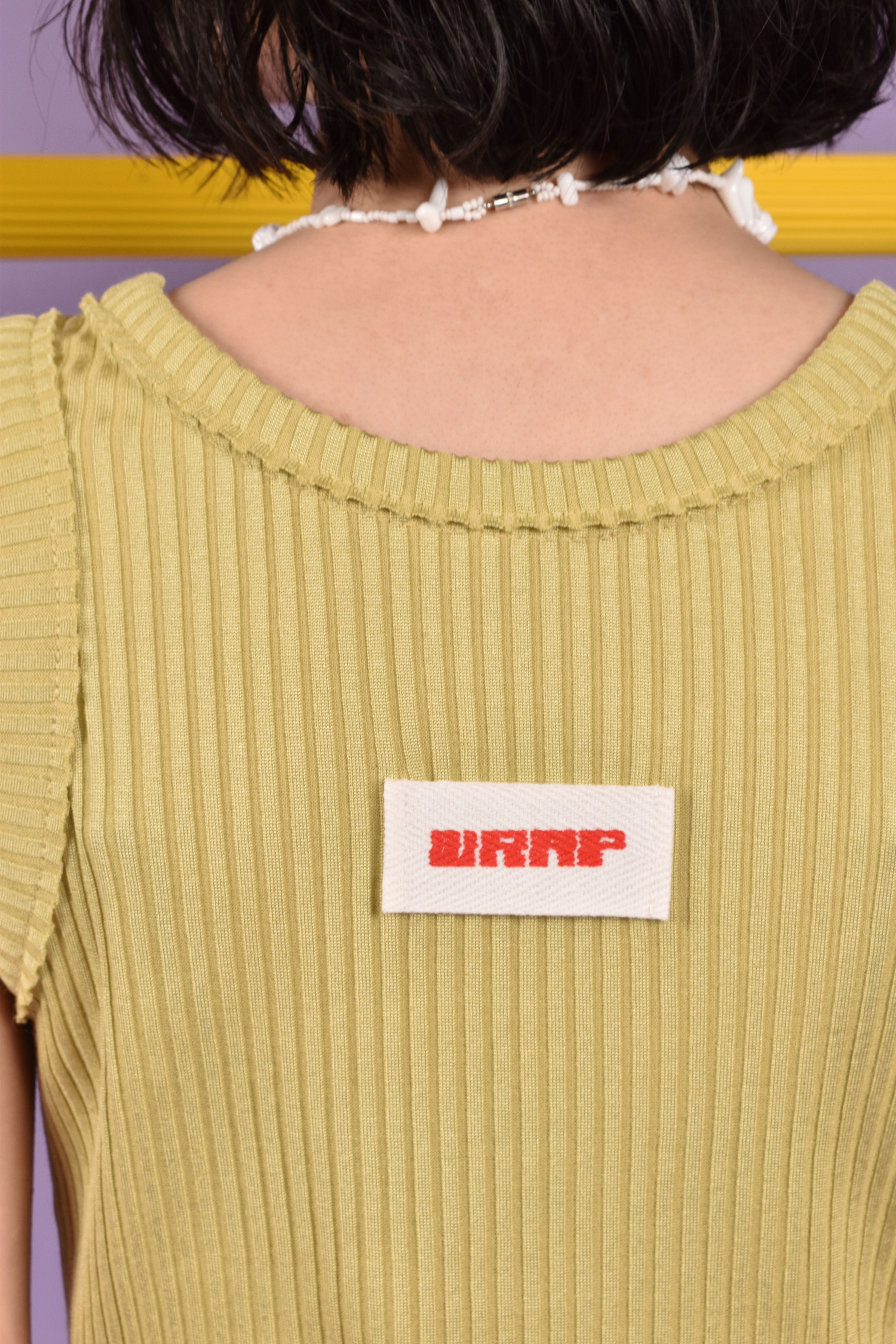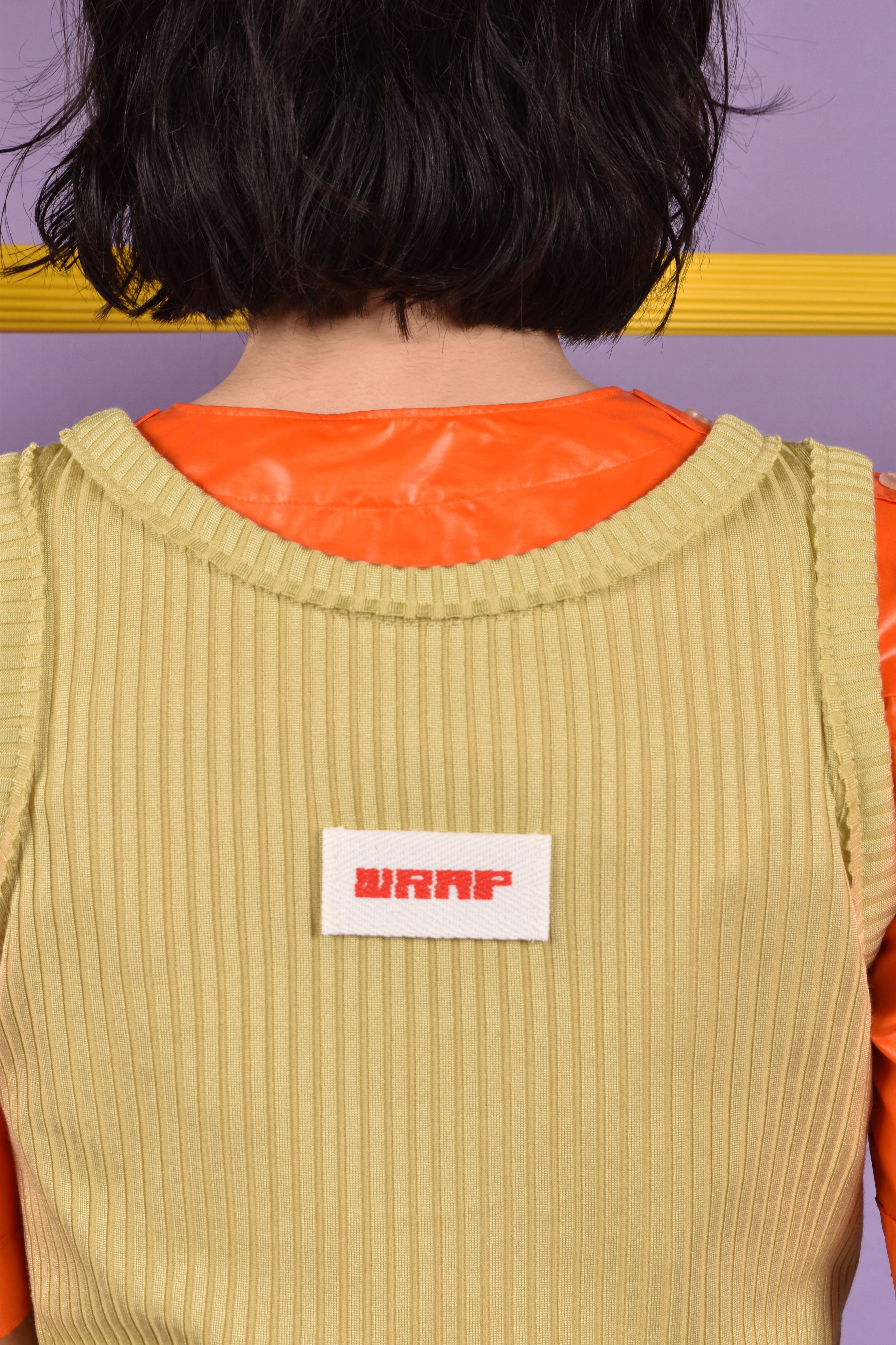 肌触りの良い太畝のリブ生地を使用したタンクトップです。高光沢で鮮やかなカラーバリエーションが魅力的。首元とアームホールの部分はカットオフデザインにしており抜け感があります。バックにアクセントとしてWRAPのネームデザインが入っております。