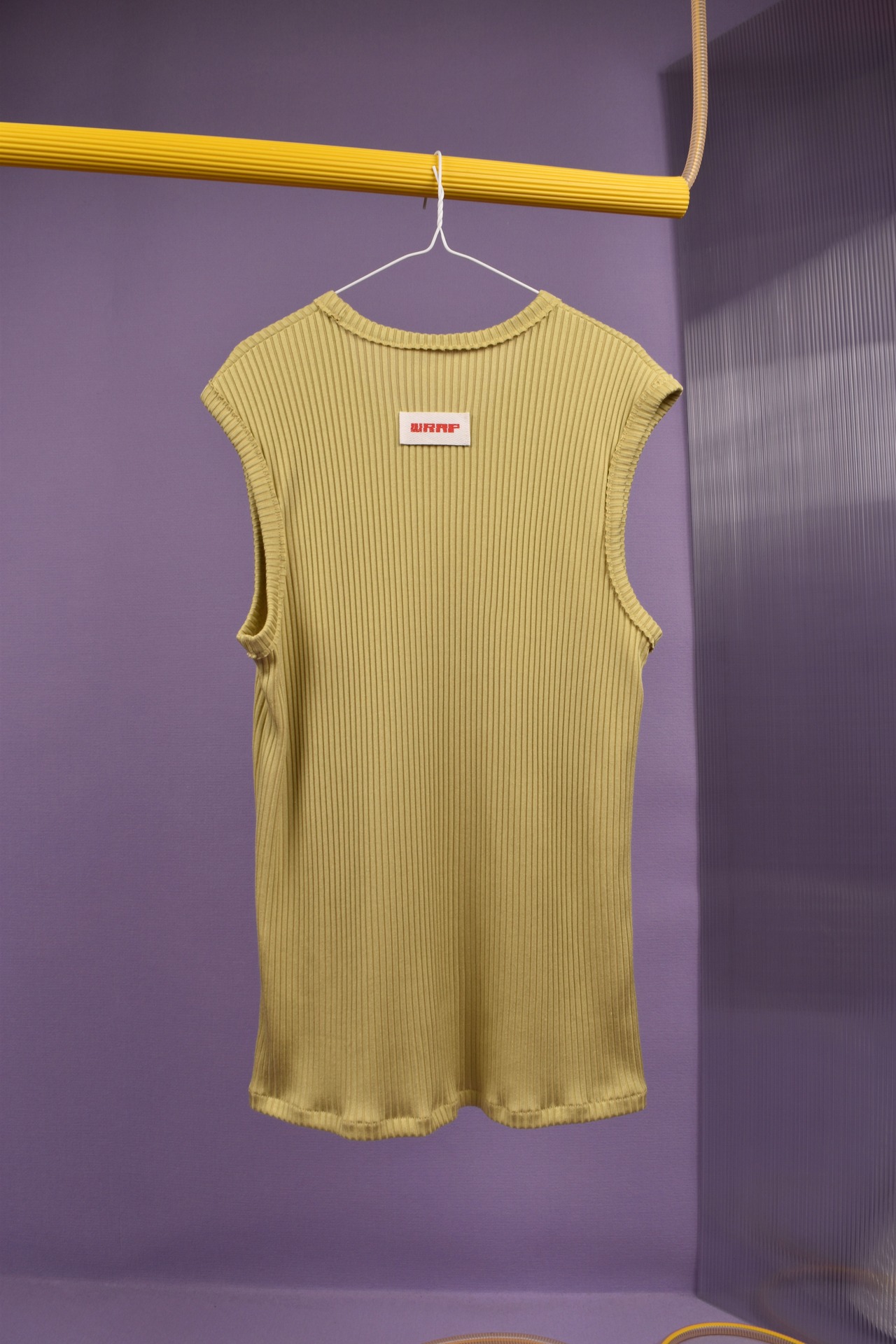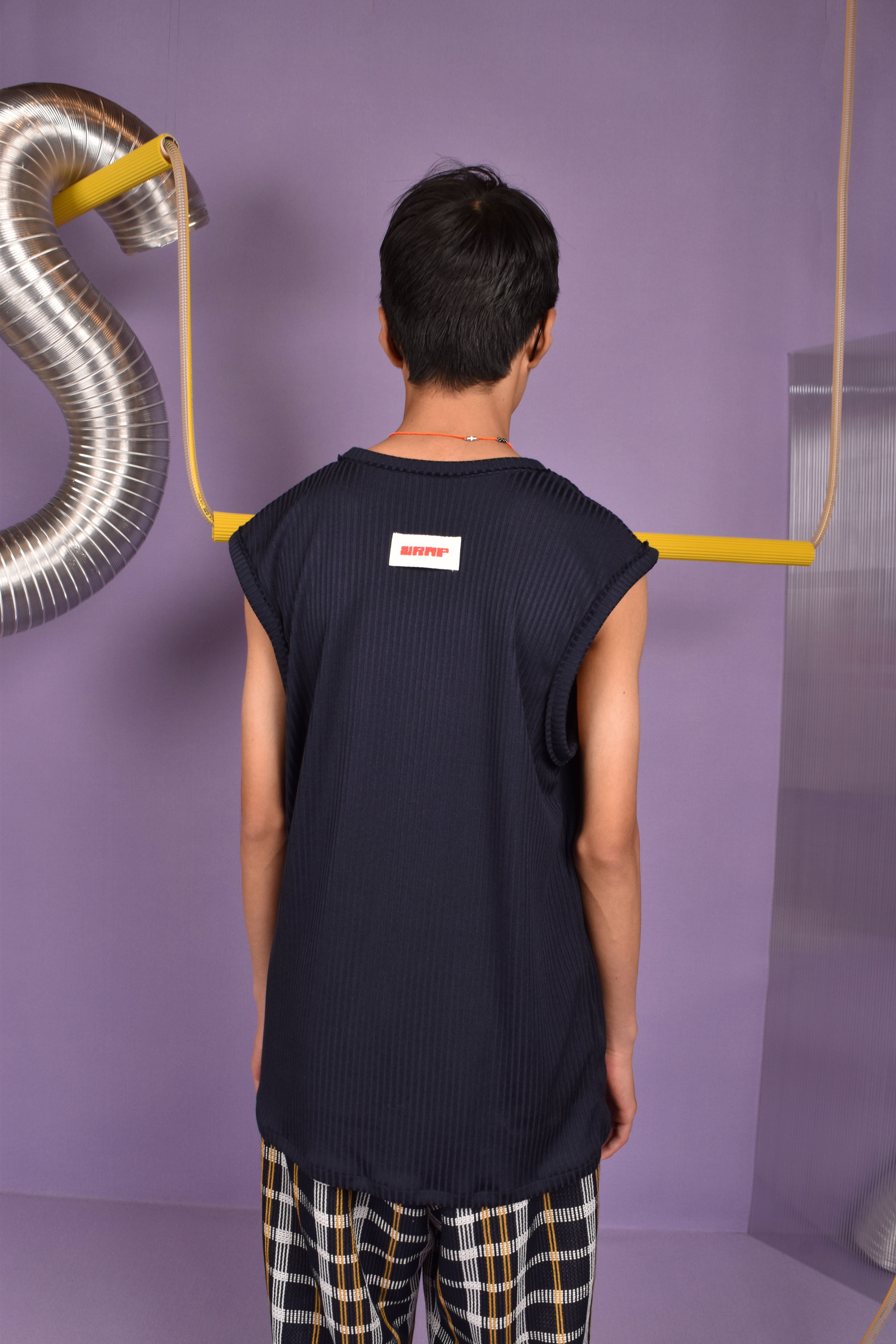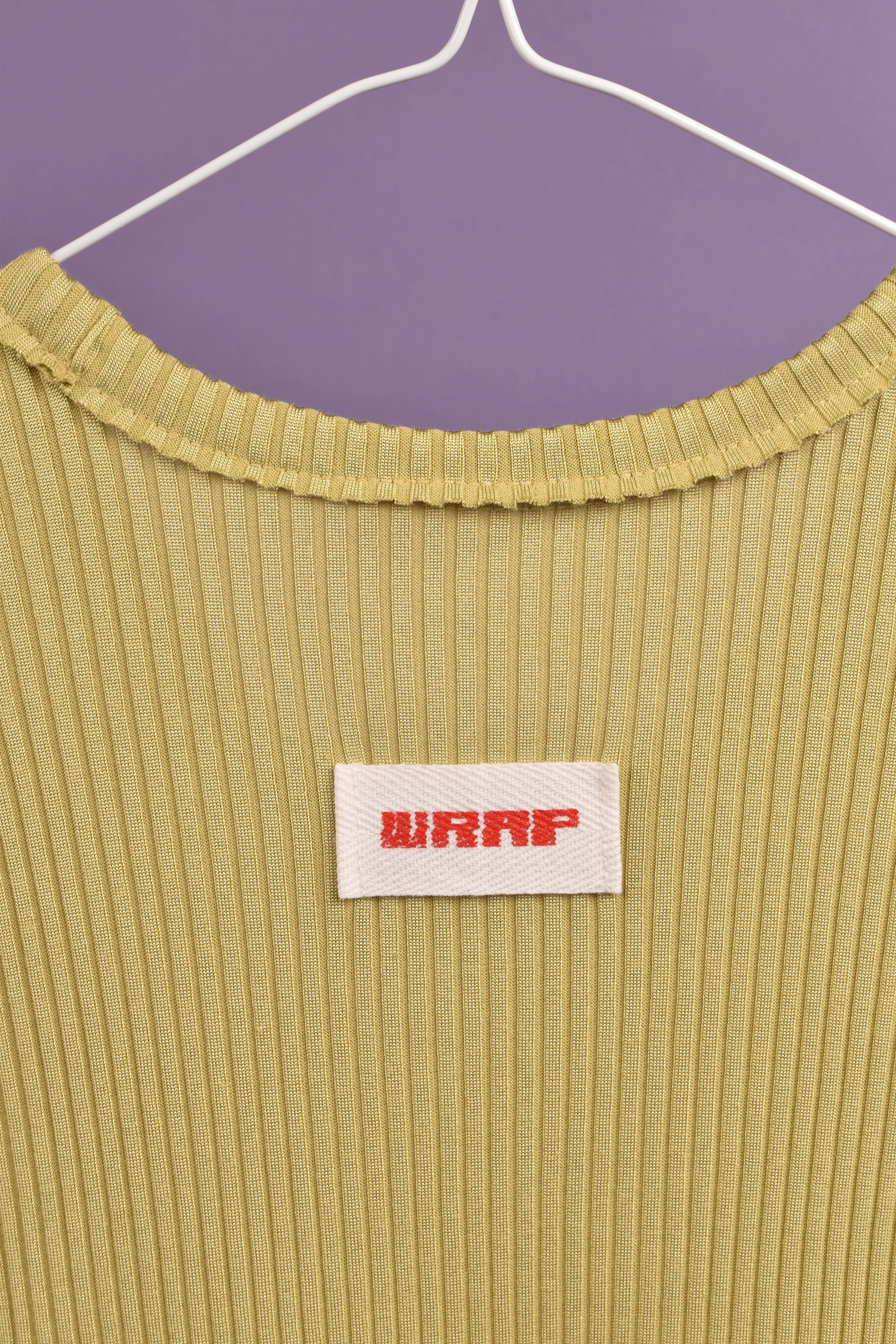 肌触りの良い太畝のリブ生地を使用したノースリーブです。高光沢で鮮やかなカラーバリエーションが魅力的。首元とアームホールの部分はカットオフデザインにしており抜け感があります。バックにアクセントとしてWRAPのネームデザインが入っております。