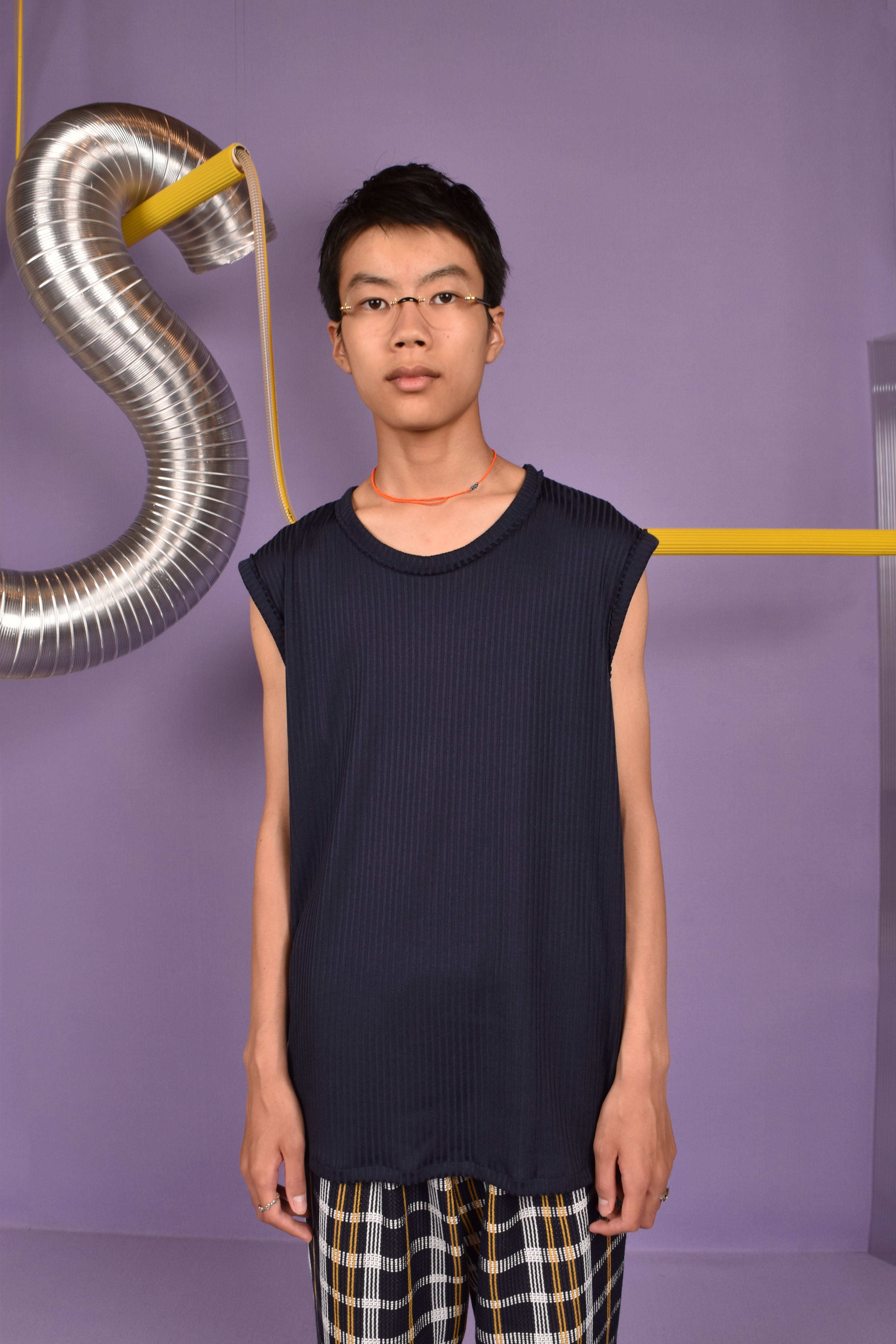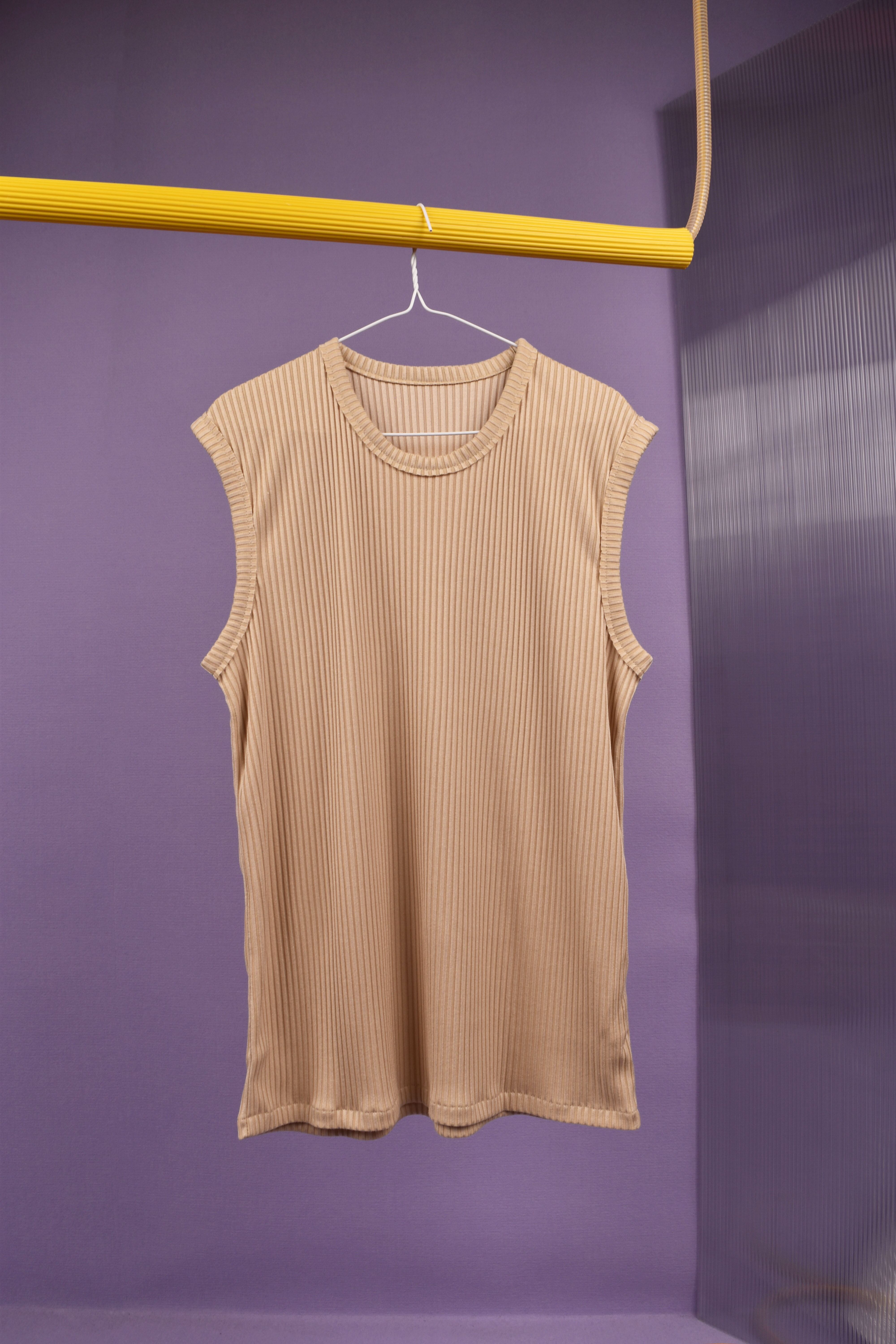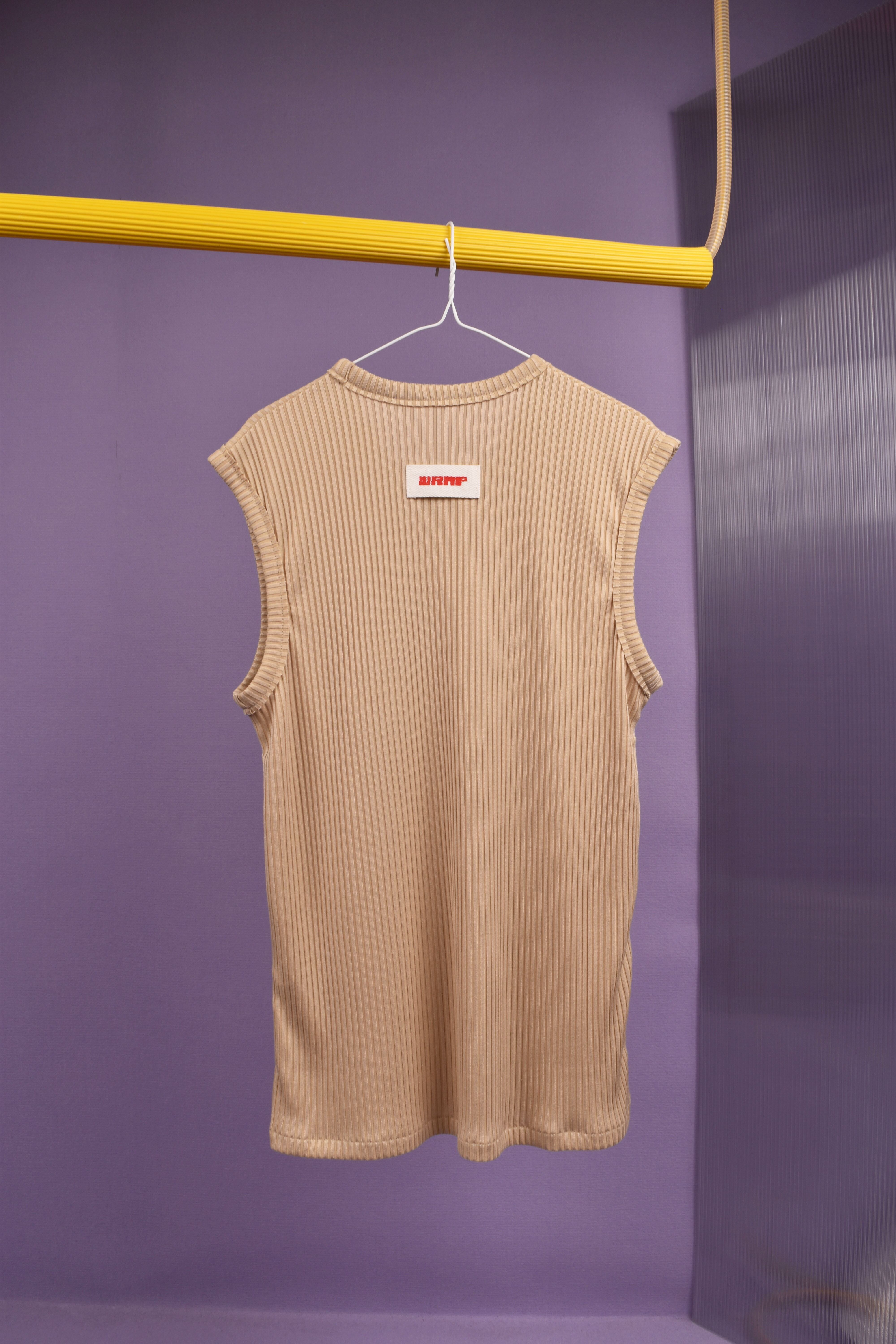 肌触りの良い太畝のリブ生地を使用したノースリーブです。高光沢で鮮やかなカラーバリエーションが魅力的。首元とアームホールの部分はカットオフデザインにしており抜け感があります。バックにアクセントとしてWRAPのネームデザインが入っております。