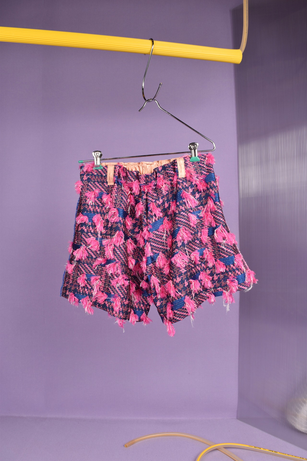 非常に面白いツイード生地とコッパーカラーの光沢のある生地を前後で切り替えたショーツです。フロントを長めにした段差のあるデザインで横からの見た目が面白いです。バックポケットはツイード生地を使用しております。両サイドにシームポケットもあります。共地のプルオーバーとセットアップもおすすめです!