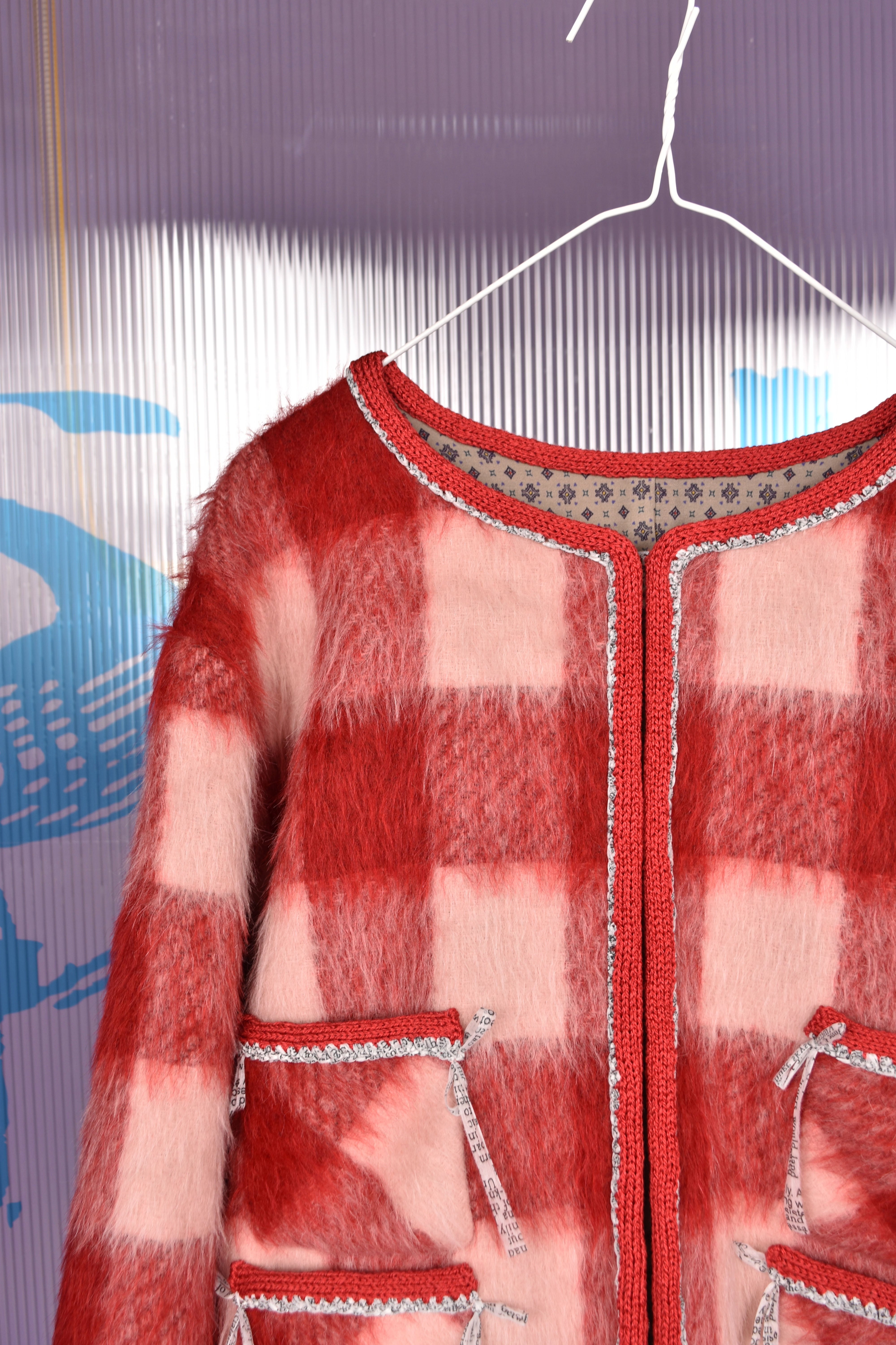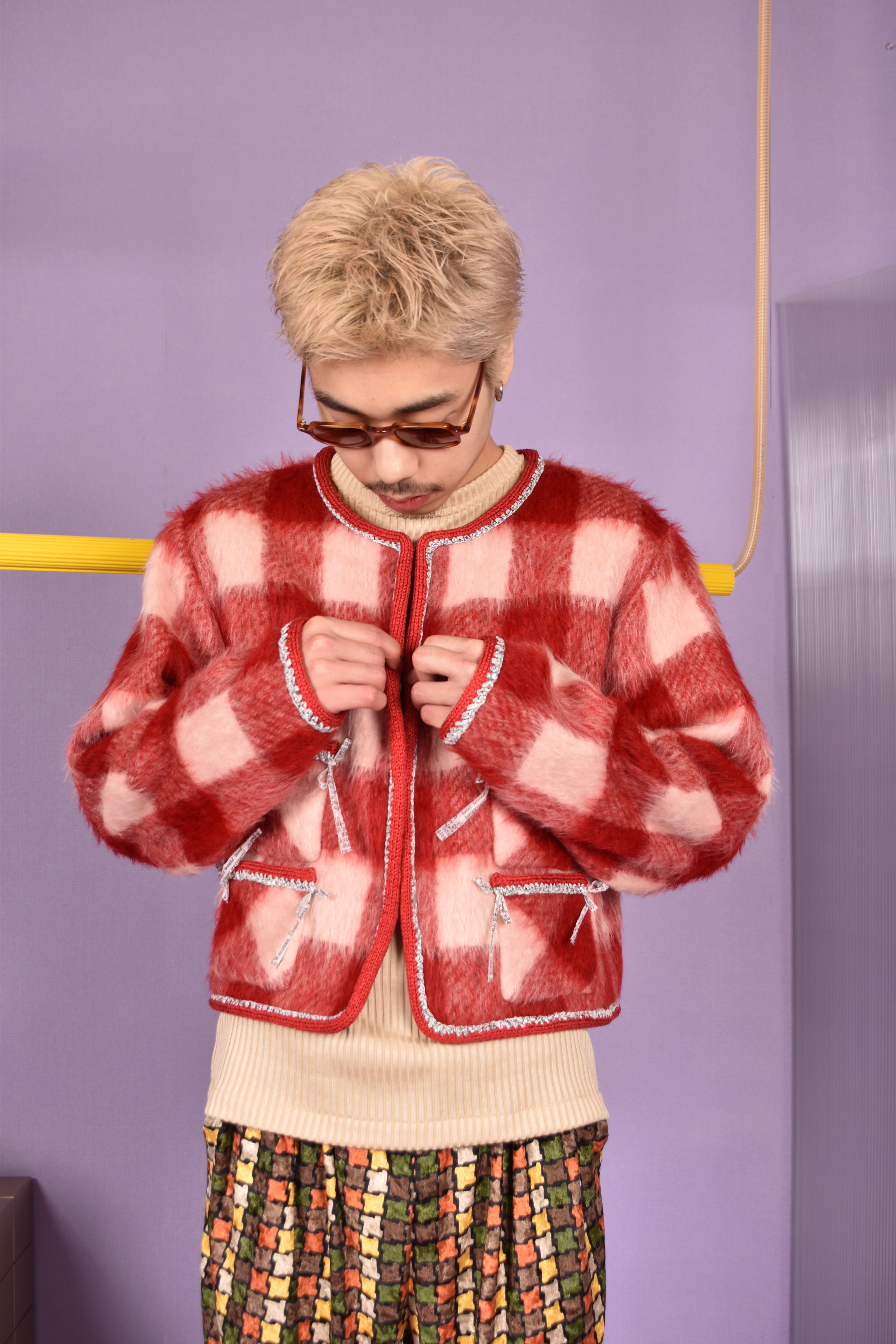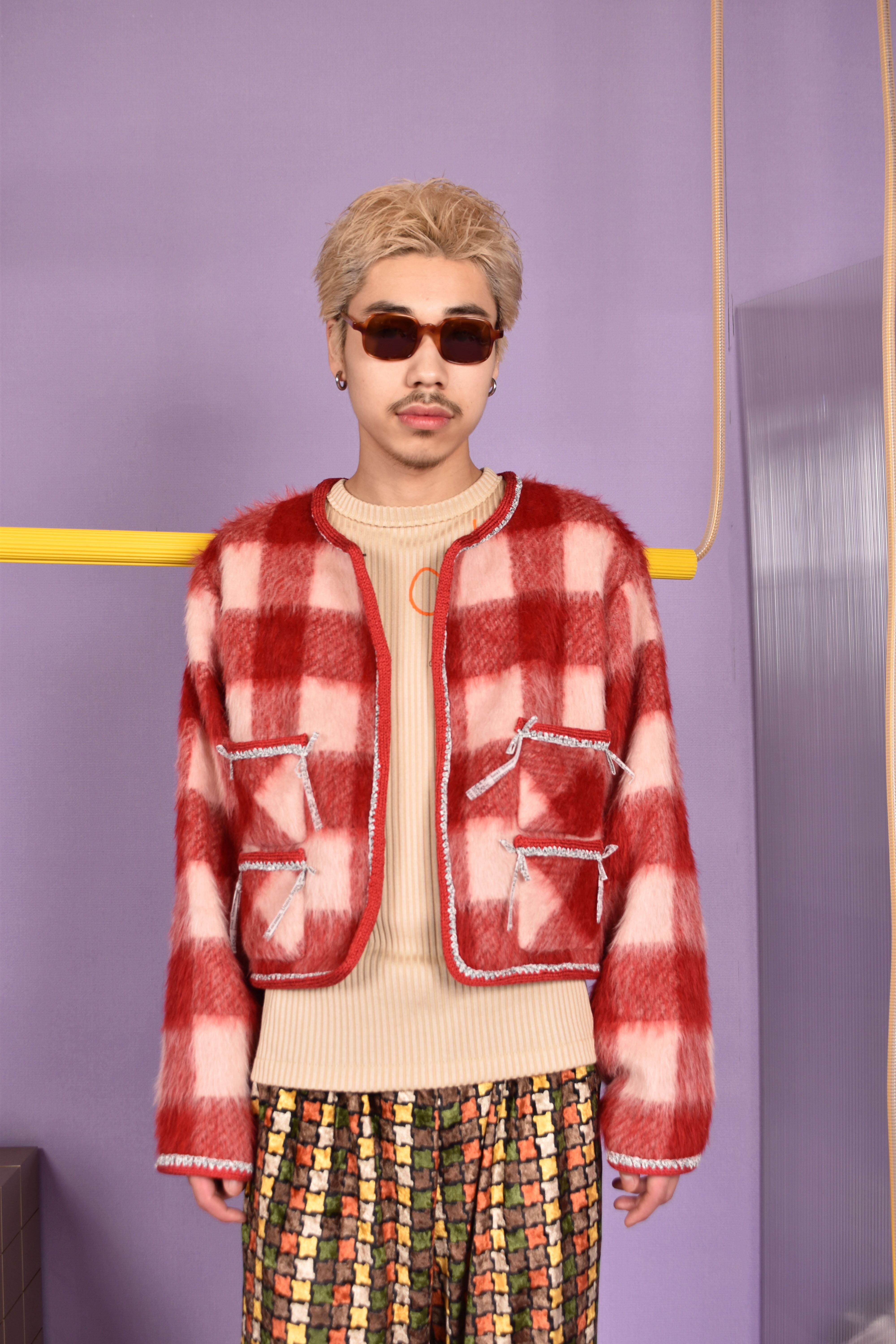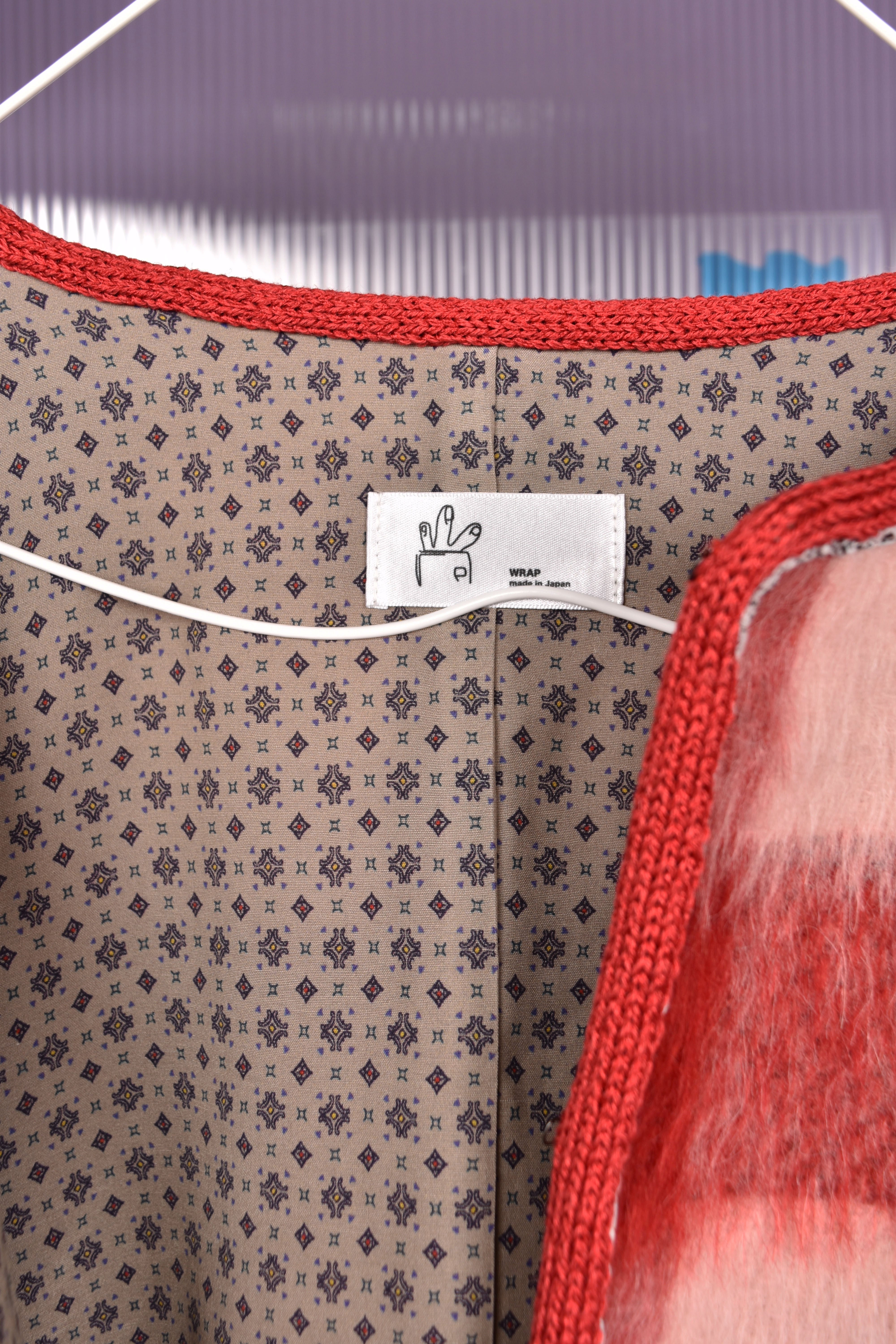 編み機で製作したニットの端に手編みでテキスト入りの不織布テープを編み足したものをパイピングテープとして使用しております。ニットの風合いを活かすために手縫いで縫い付けています。裏地には非常に滑らかなレーヨン+キュプラ生地を使用。ビンテージの要素もある総柄がポイントになっています。
