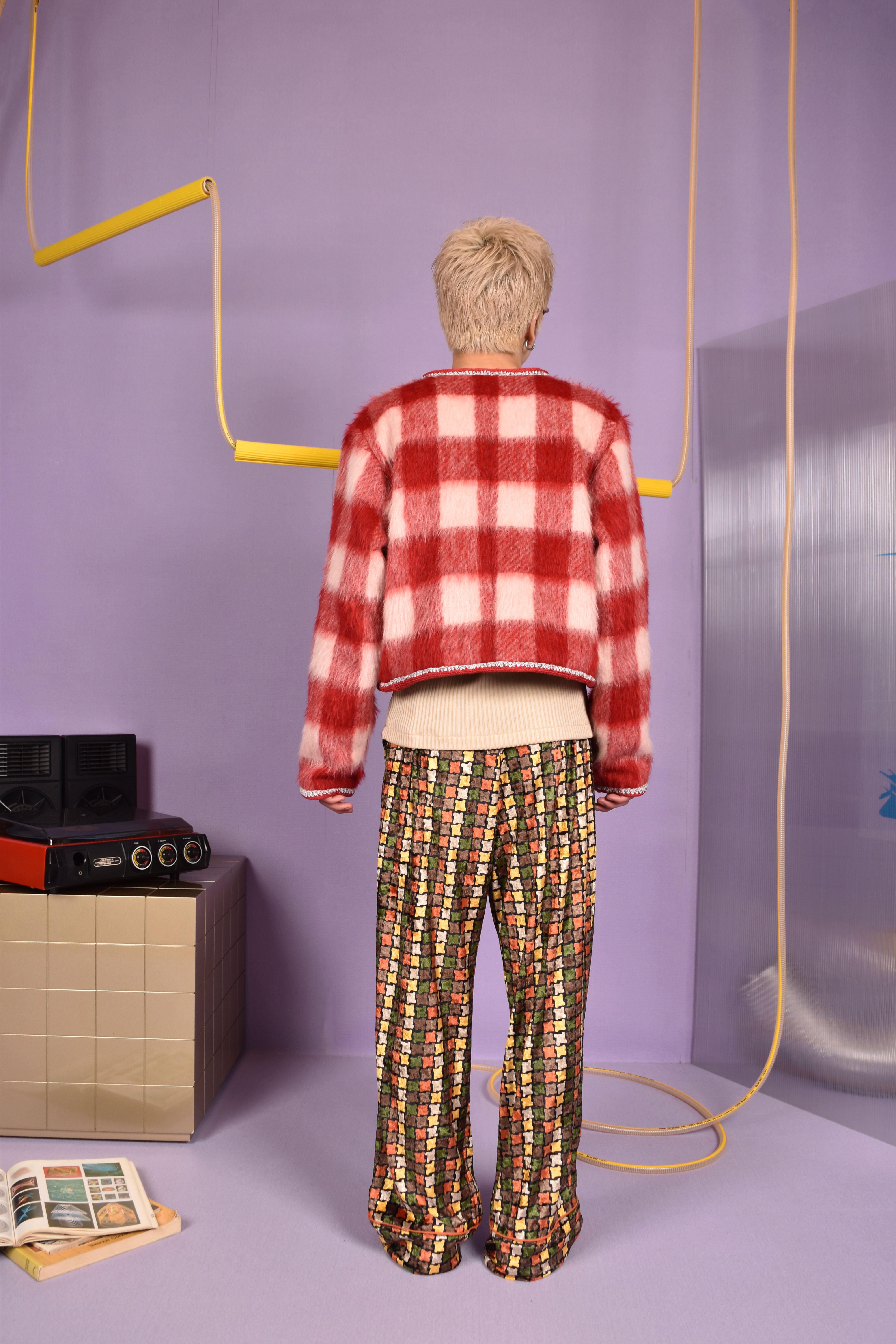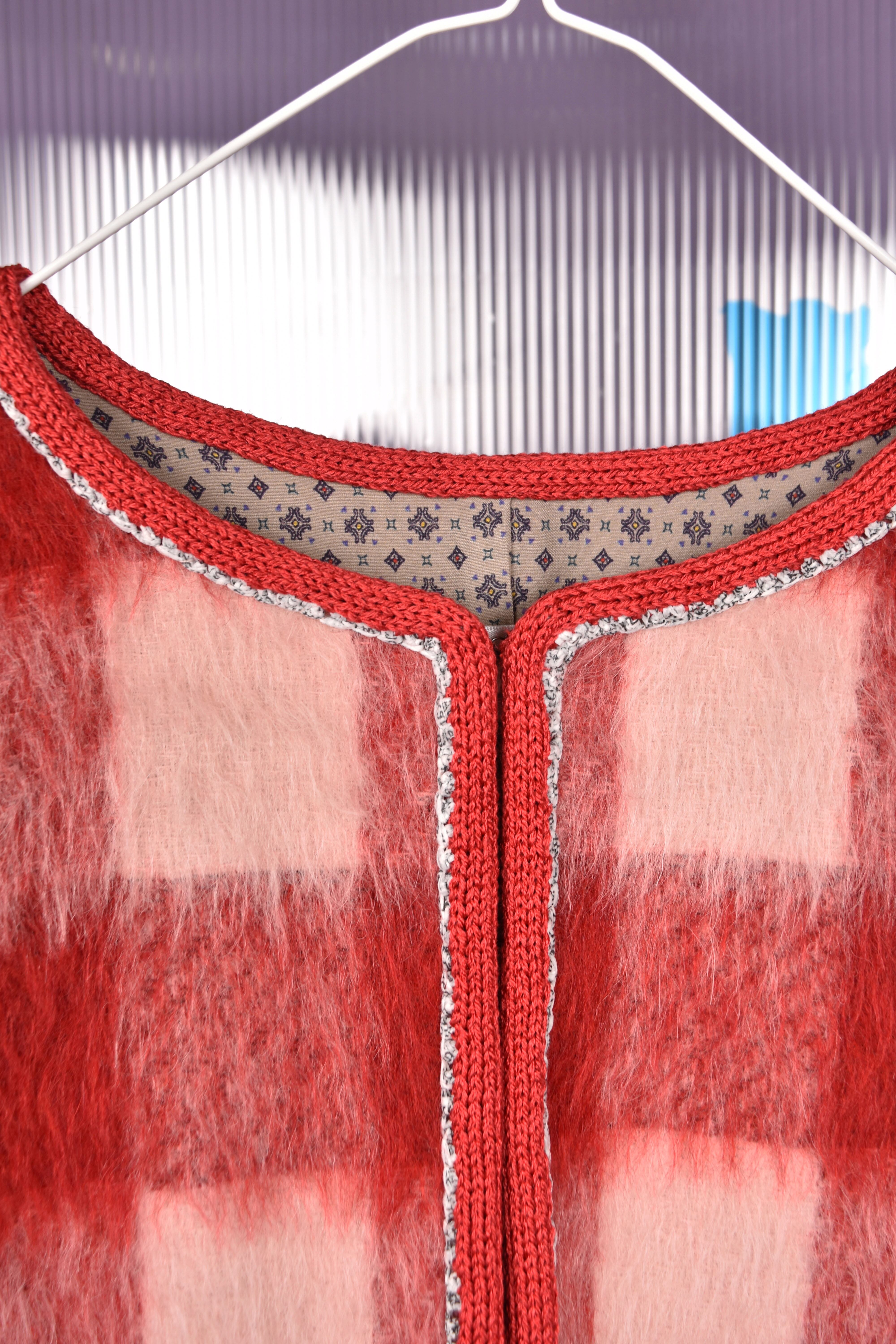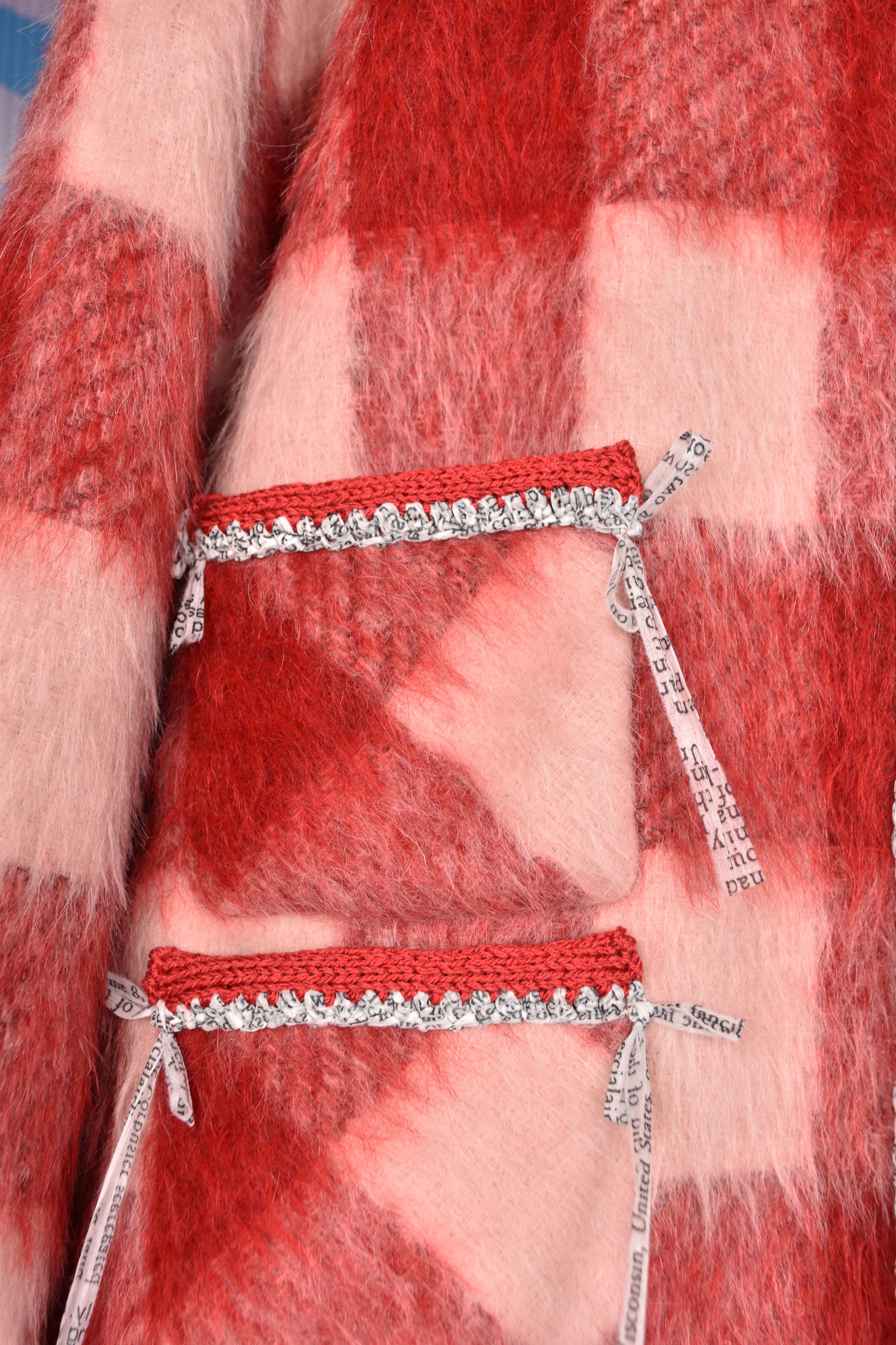 編み機で製作したニットの端に手編みでテキスト入りの不織布テープを編み足したものをパイピングテープとして使用しております。ニットの風合いを活かすために手縫いで縫い付けています。裏地には非常に滑らかなレーヨン+キュプラ生地を使用。ビンテージの要素もある総柄がポイントになっています。