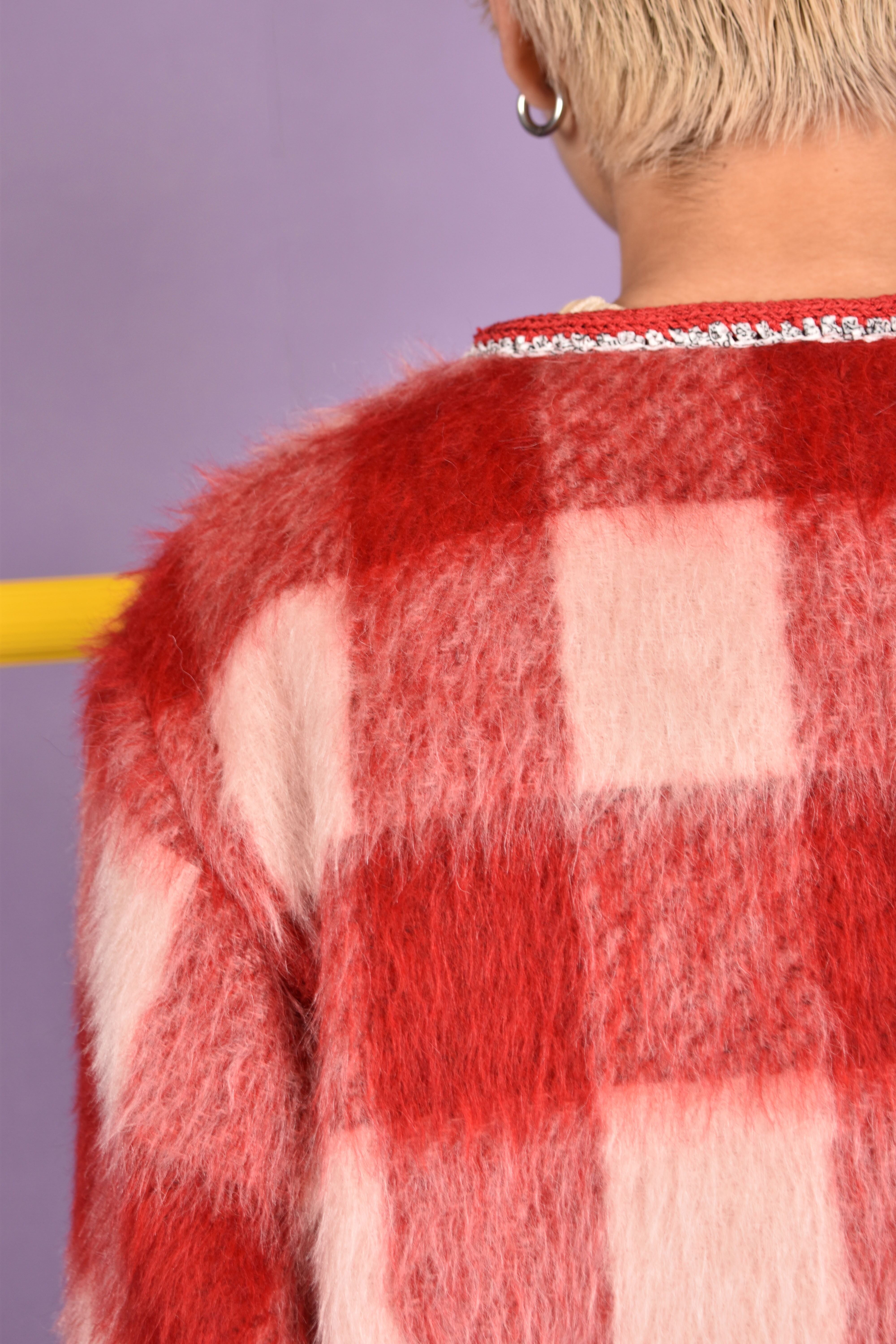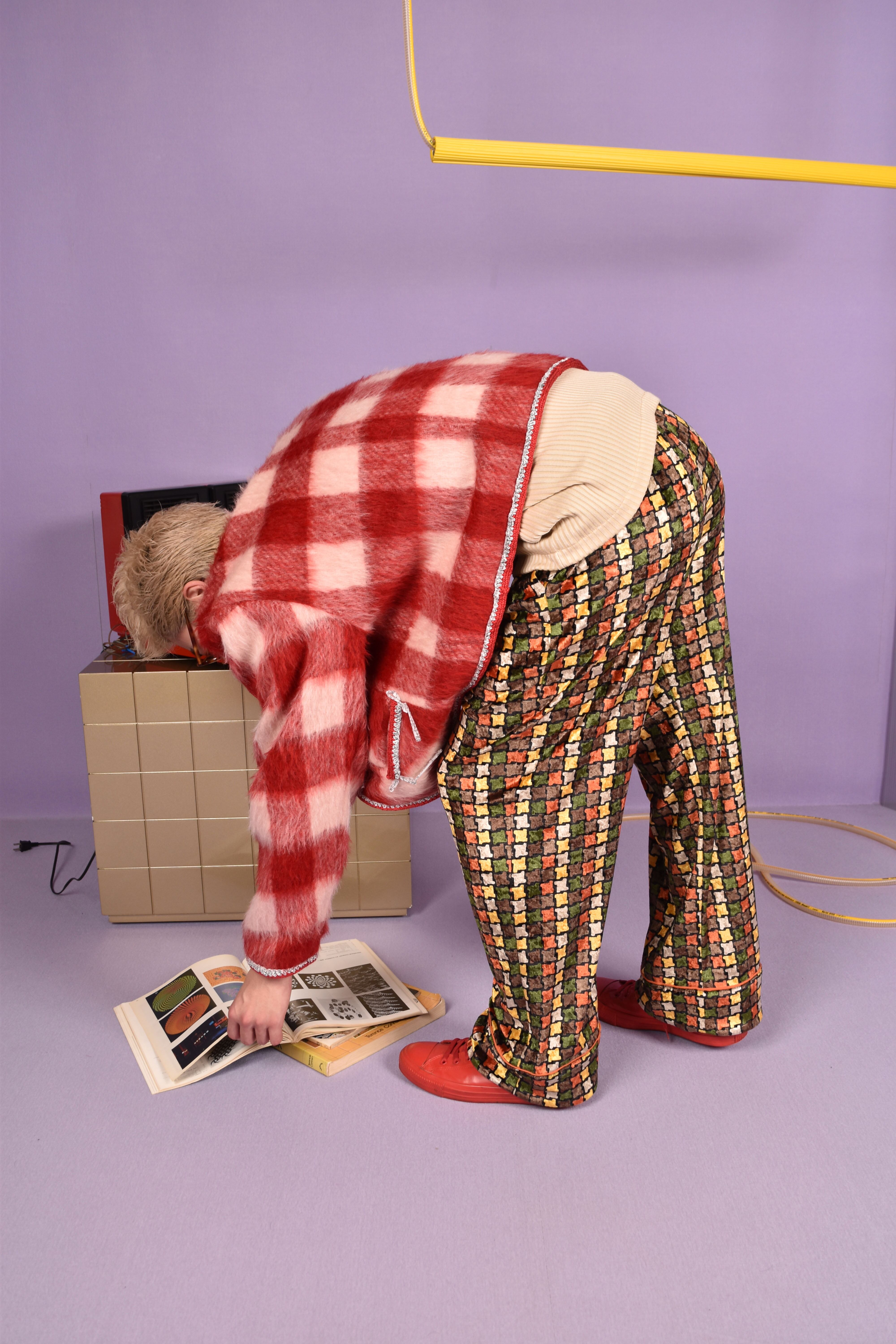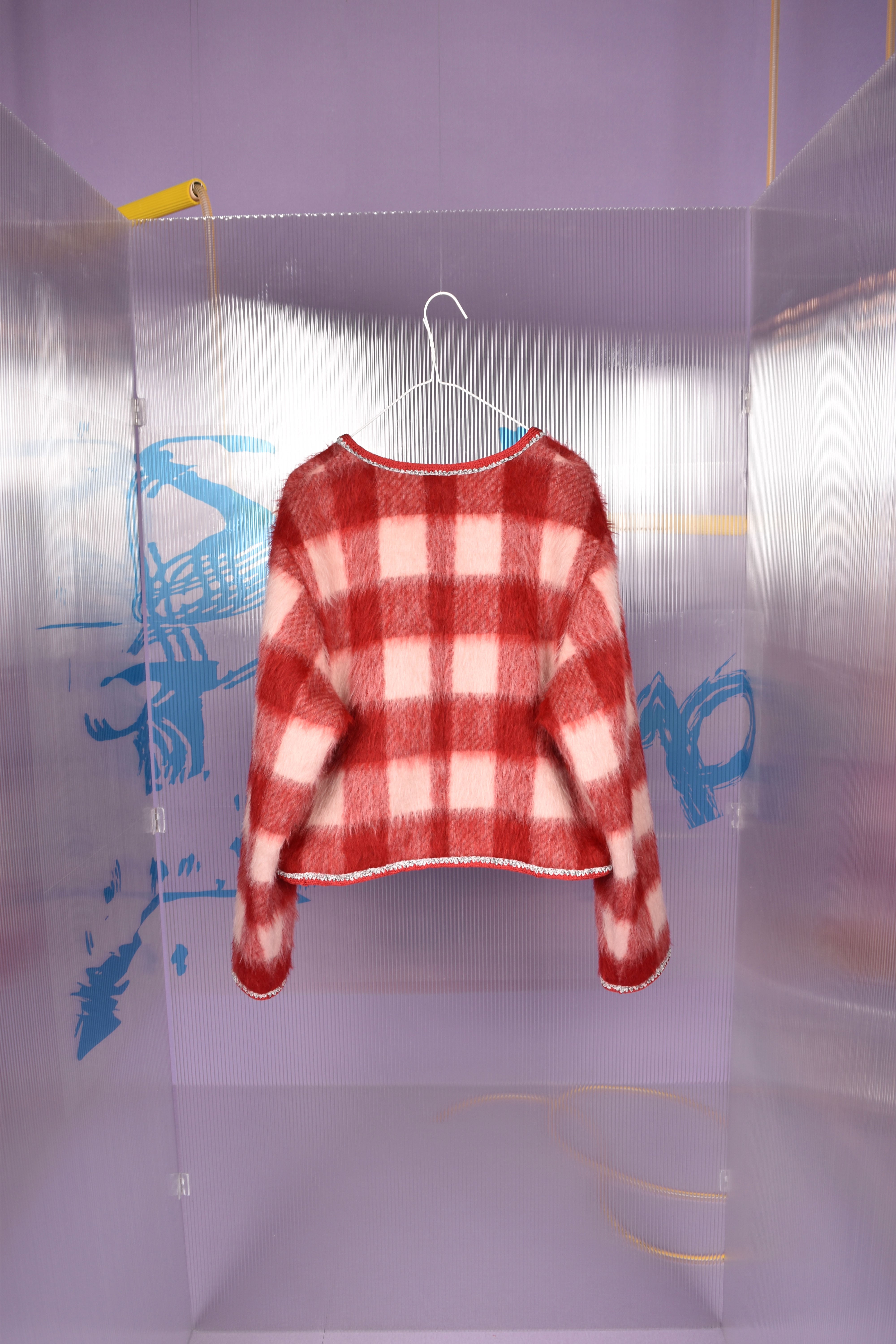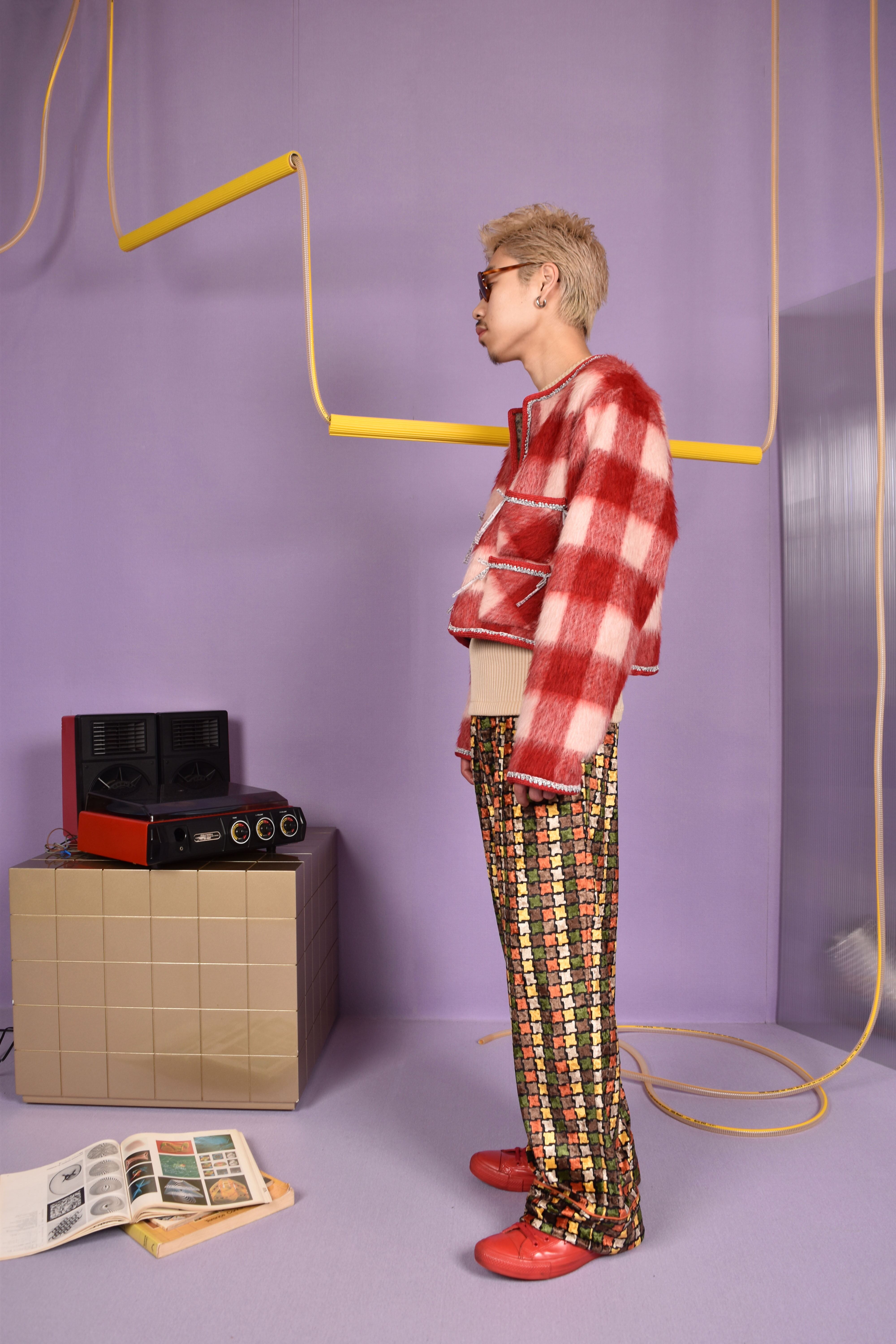 編み機で製作したニットの端に手編みでテキスト入りの不織布テープを編み足したものをパイピングテープとして使用しております。ニットの風合いを活かすために手縫いで縫い付けています。裏地には非常に滑らかなレーヨン+キュプラ生地を使用。ビンテージの要素もある総柄がポイントになっています。