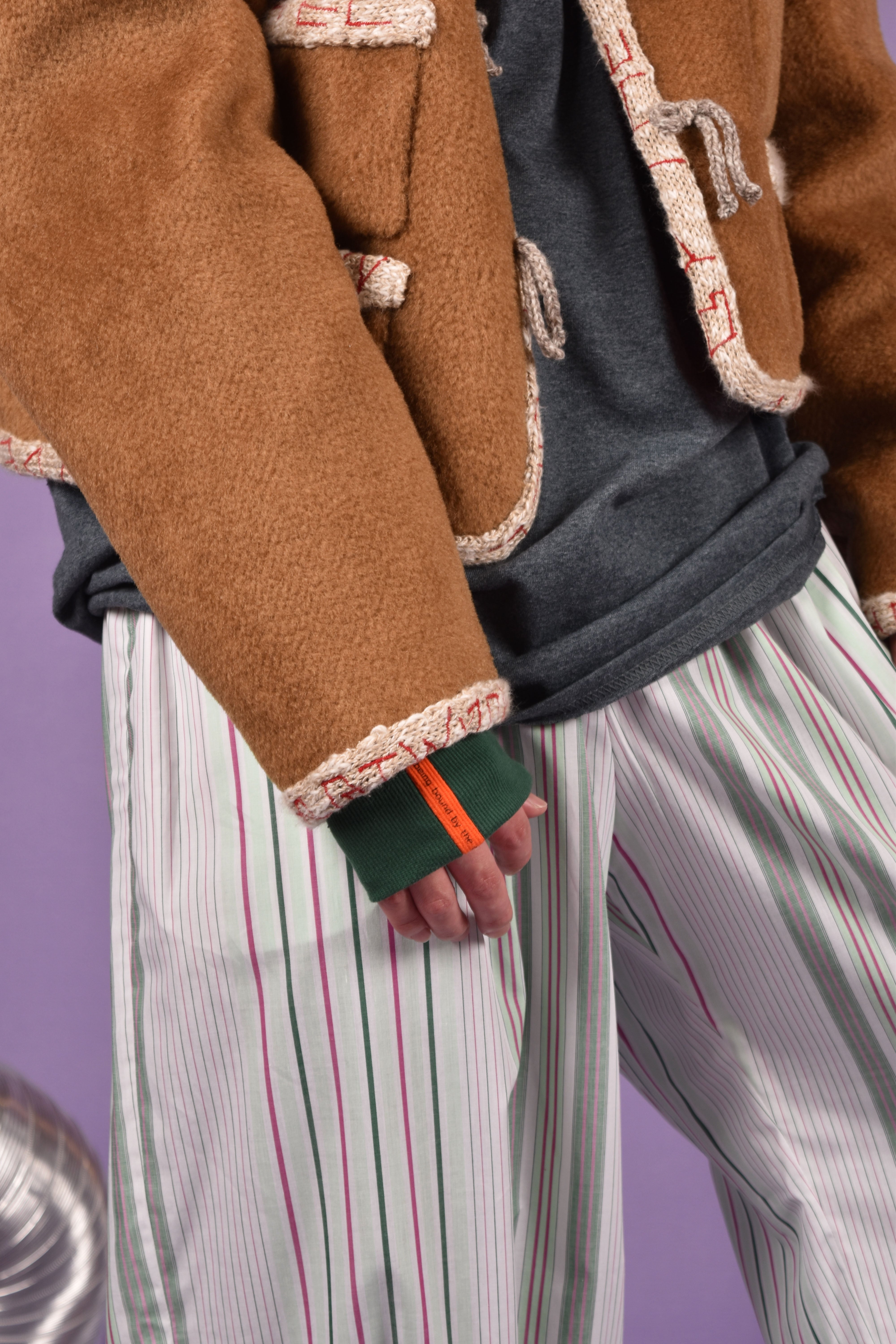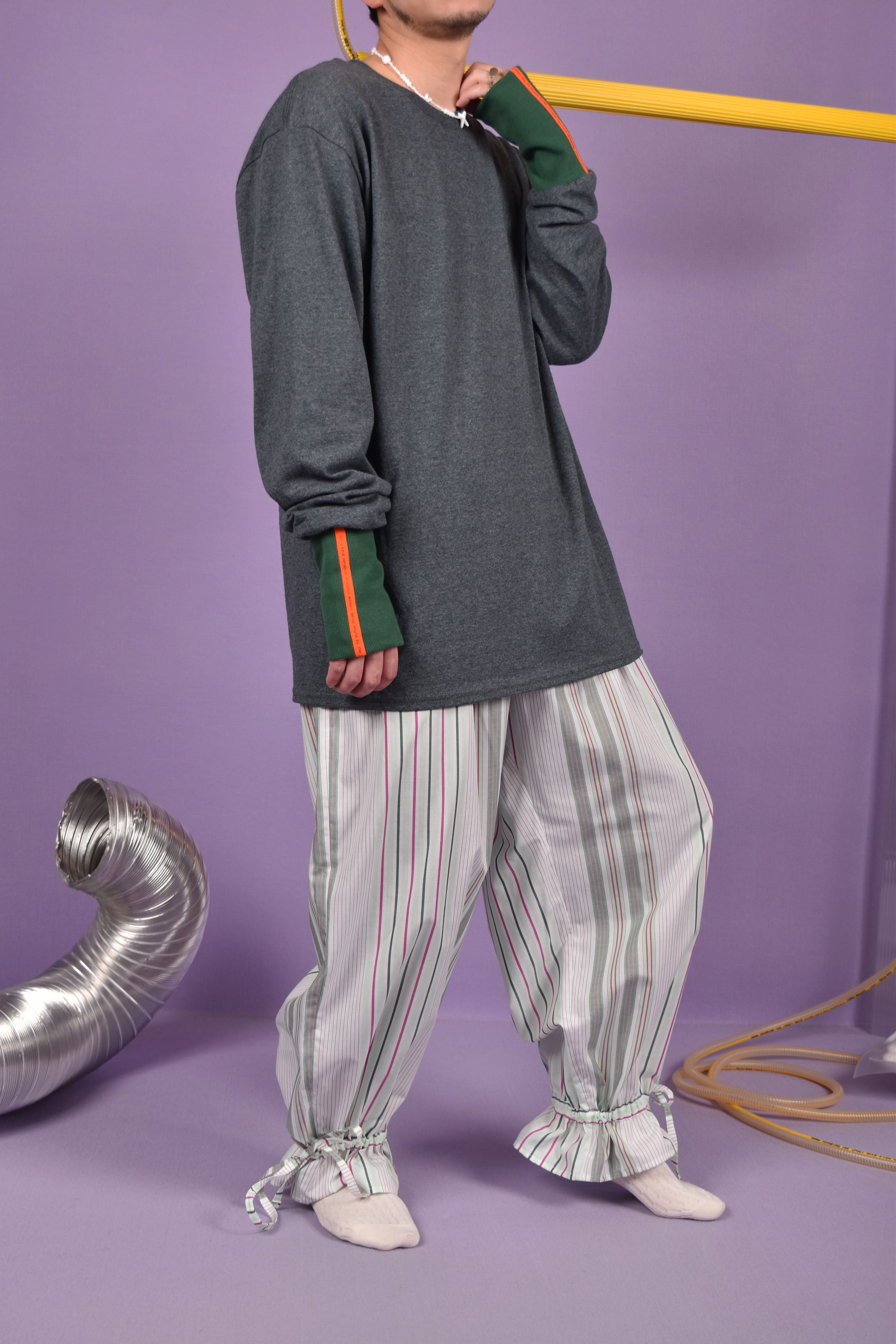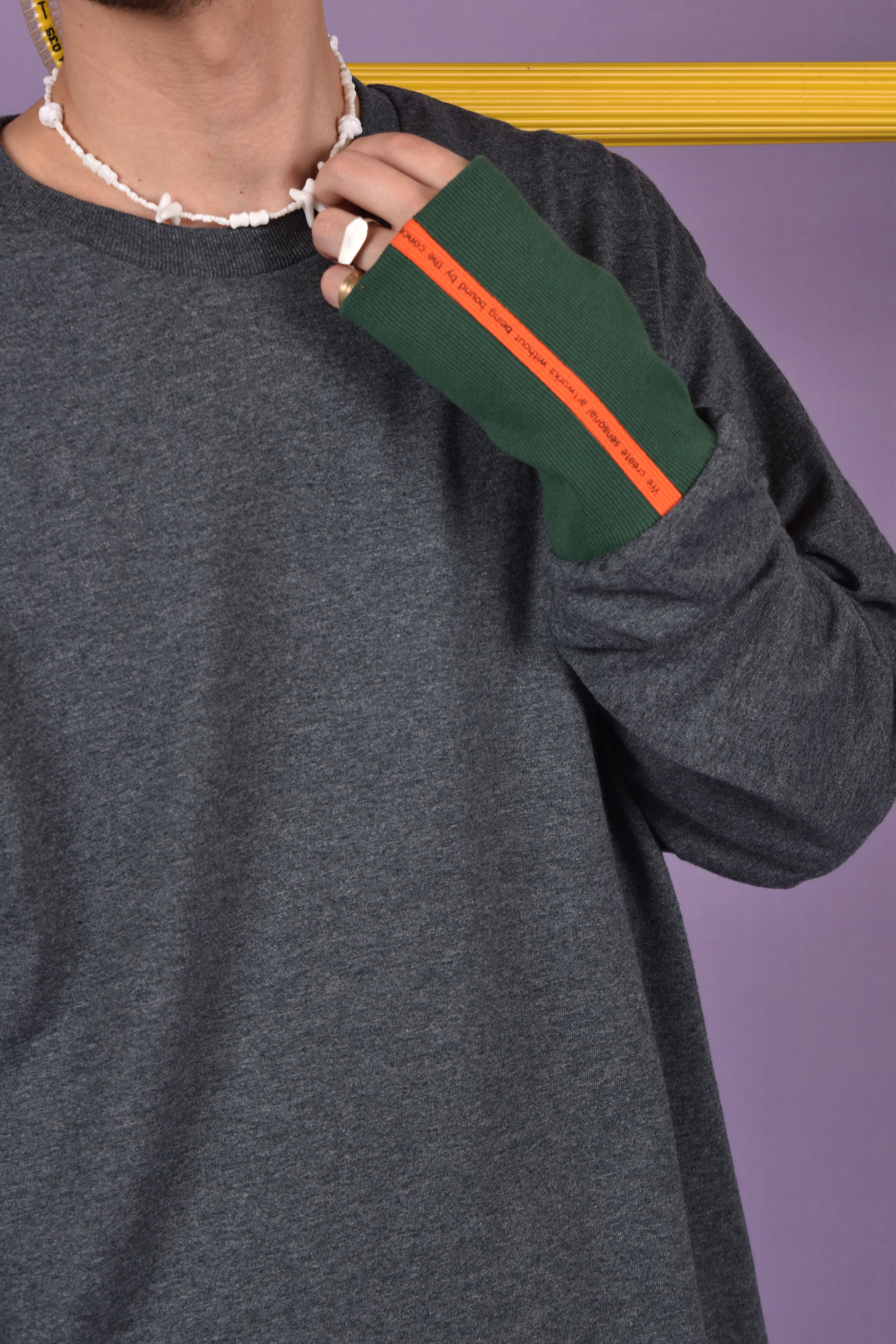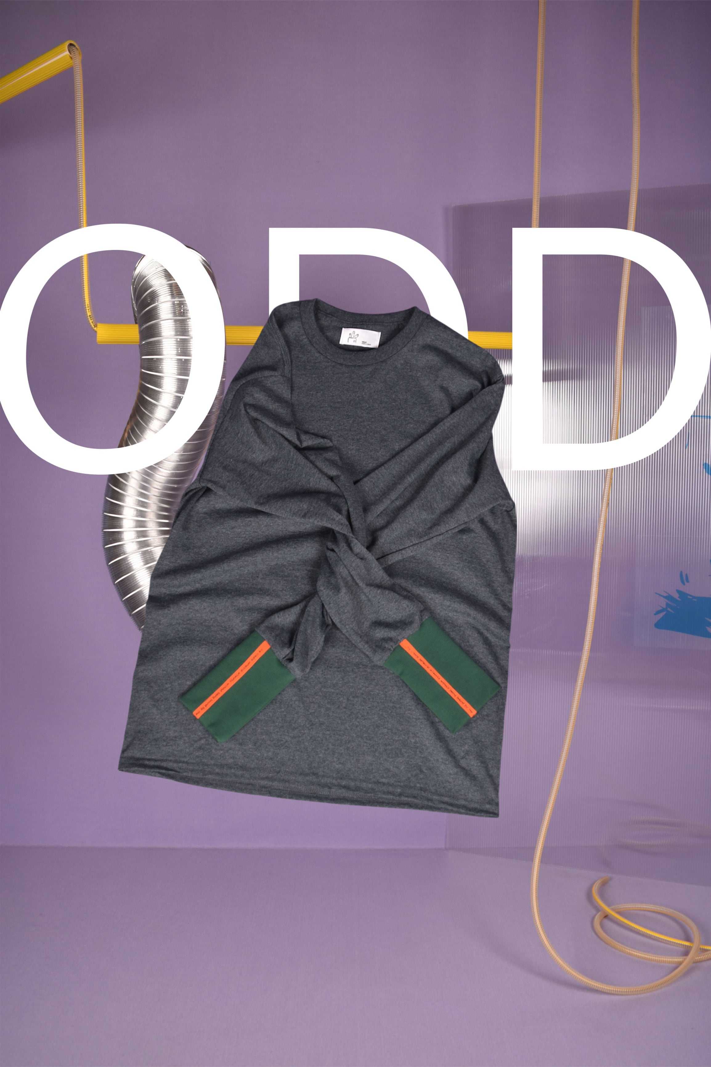 ODD L/S TEEは一般的にプリントTEEなどで使用されるようなUSAメーカーのボディを敢えて使用し、その袖リブをカット、全国からコツコツと集めた特徴的なスパンテレコ生地を使ってオリジナルのリブを製作し組み合わせました。通常の袖リブの2倍以上の長さとし全体のバランスを崩しました。