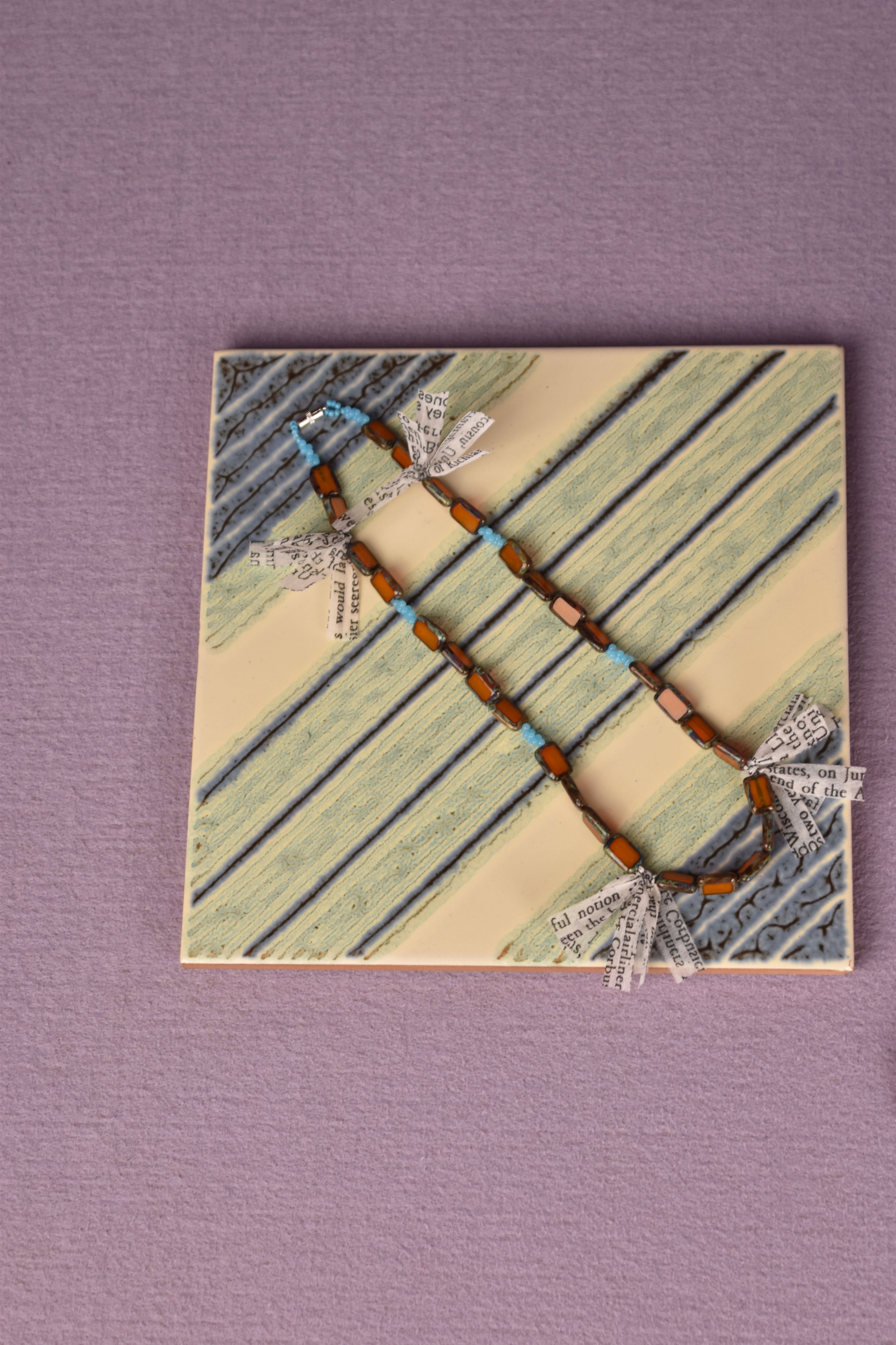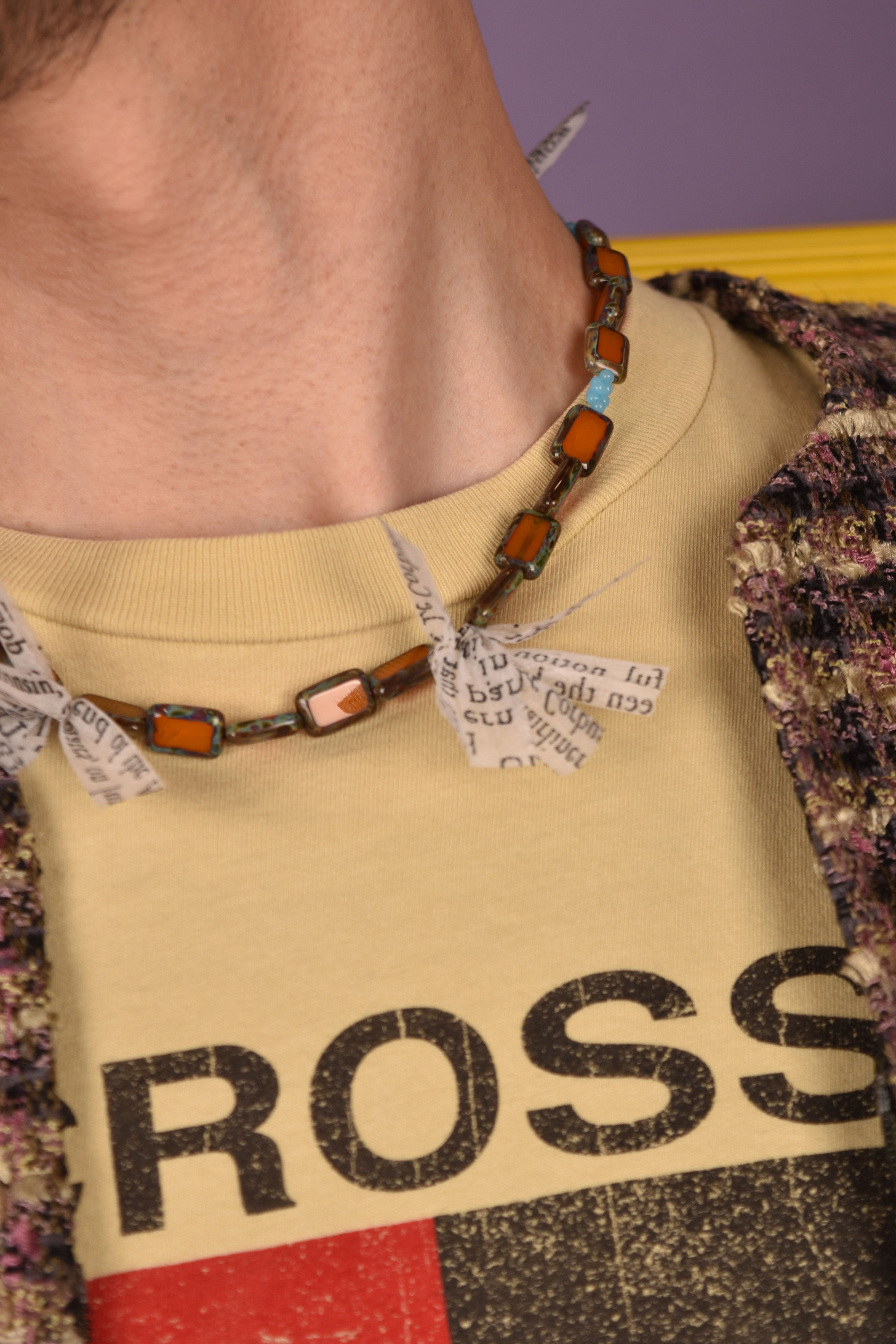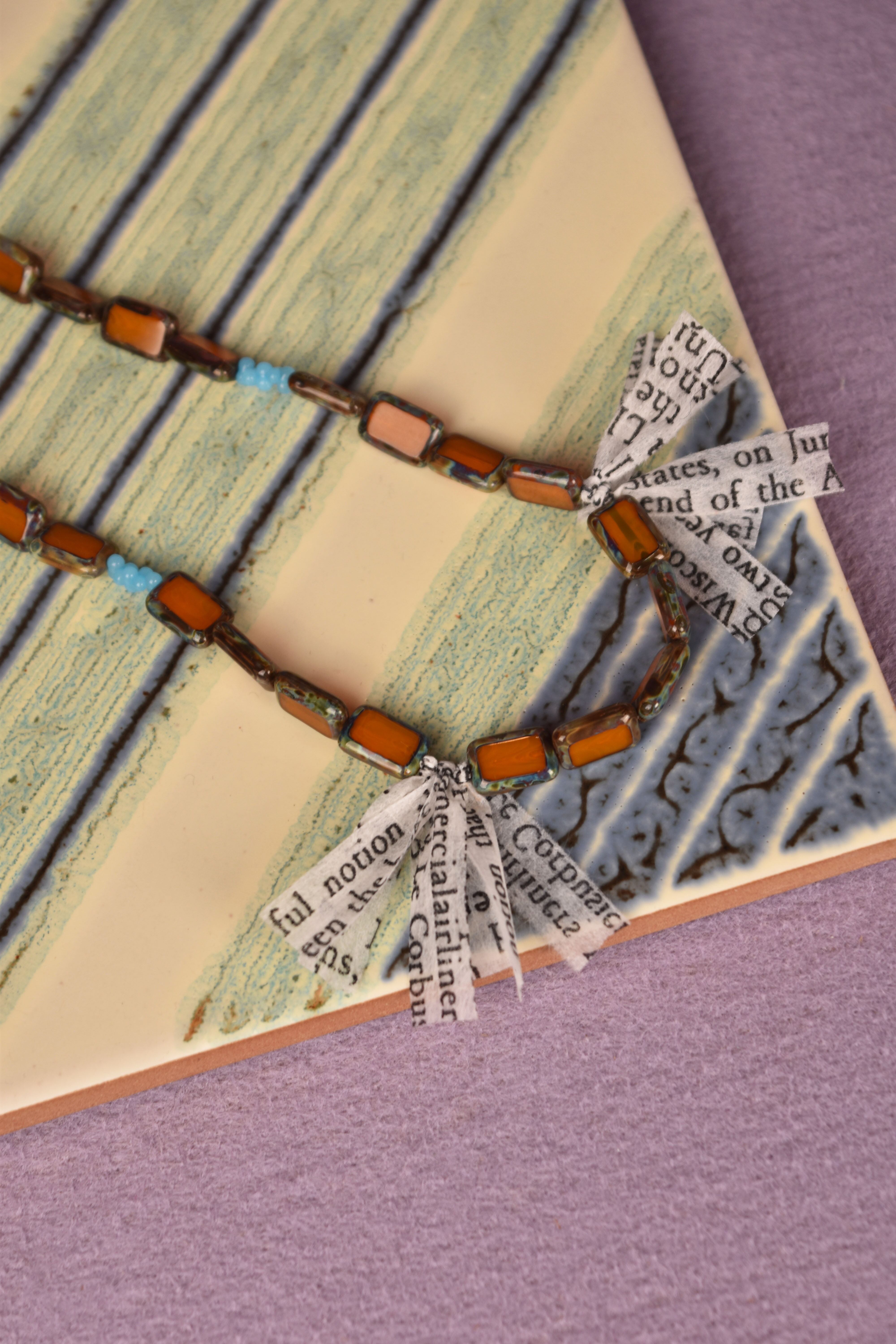 主にヨーロッパのアンティークガラスビーズを使用したネックレスです。モダンエスニックをテーマに製作し、鳥の羽の代わりにテキストプリントが入った不織布を使用しました。マグネット仕様なので脱着が容易です。ユニセックスとなります。貴重なビーズですので少量限定販売です。