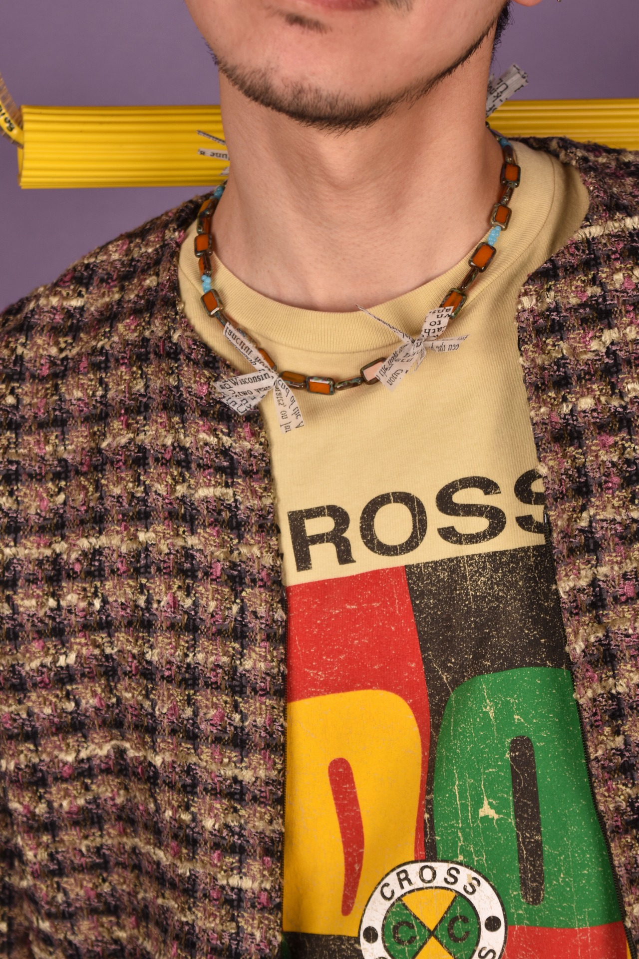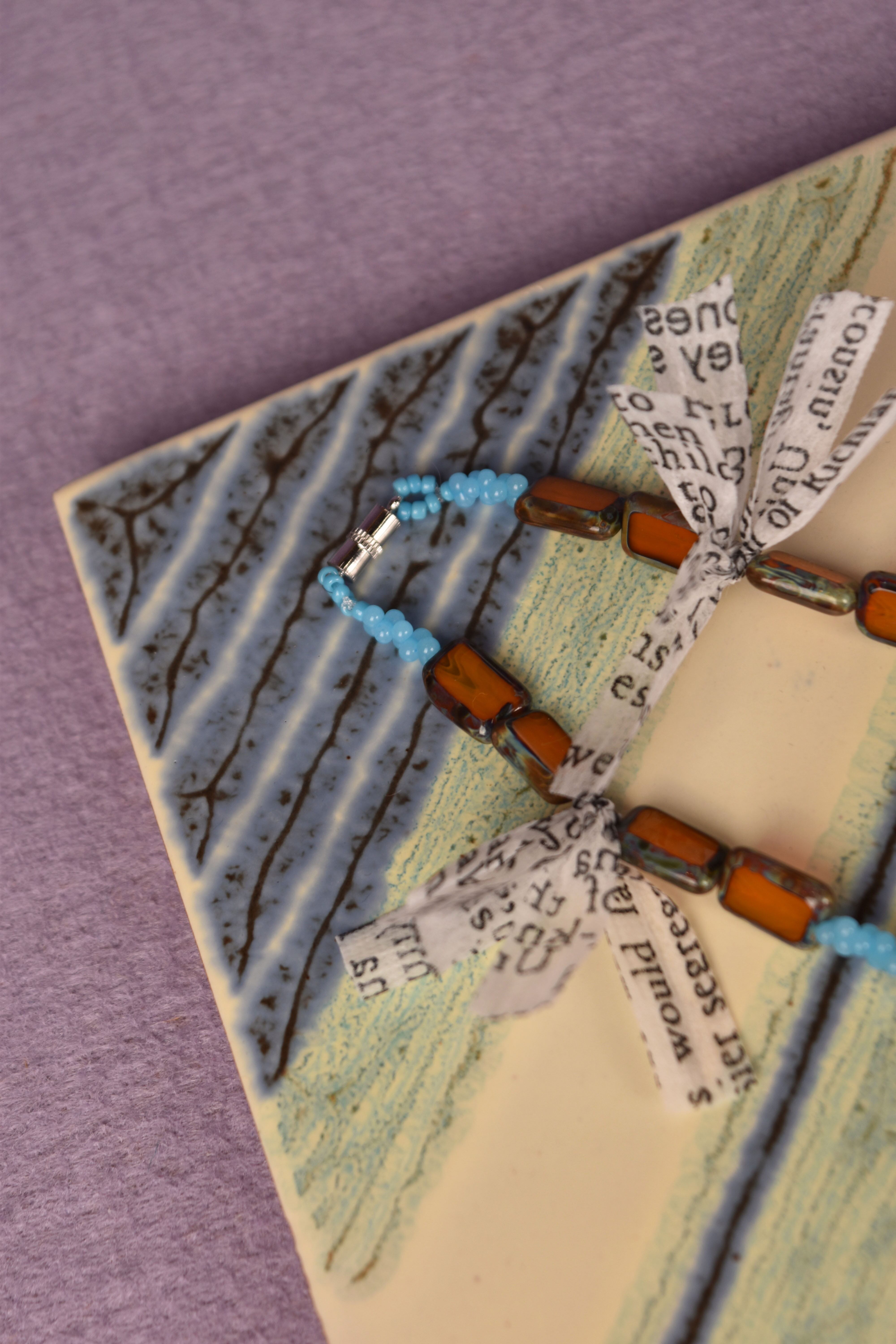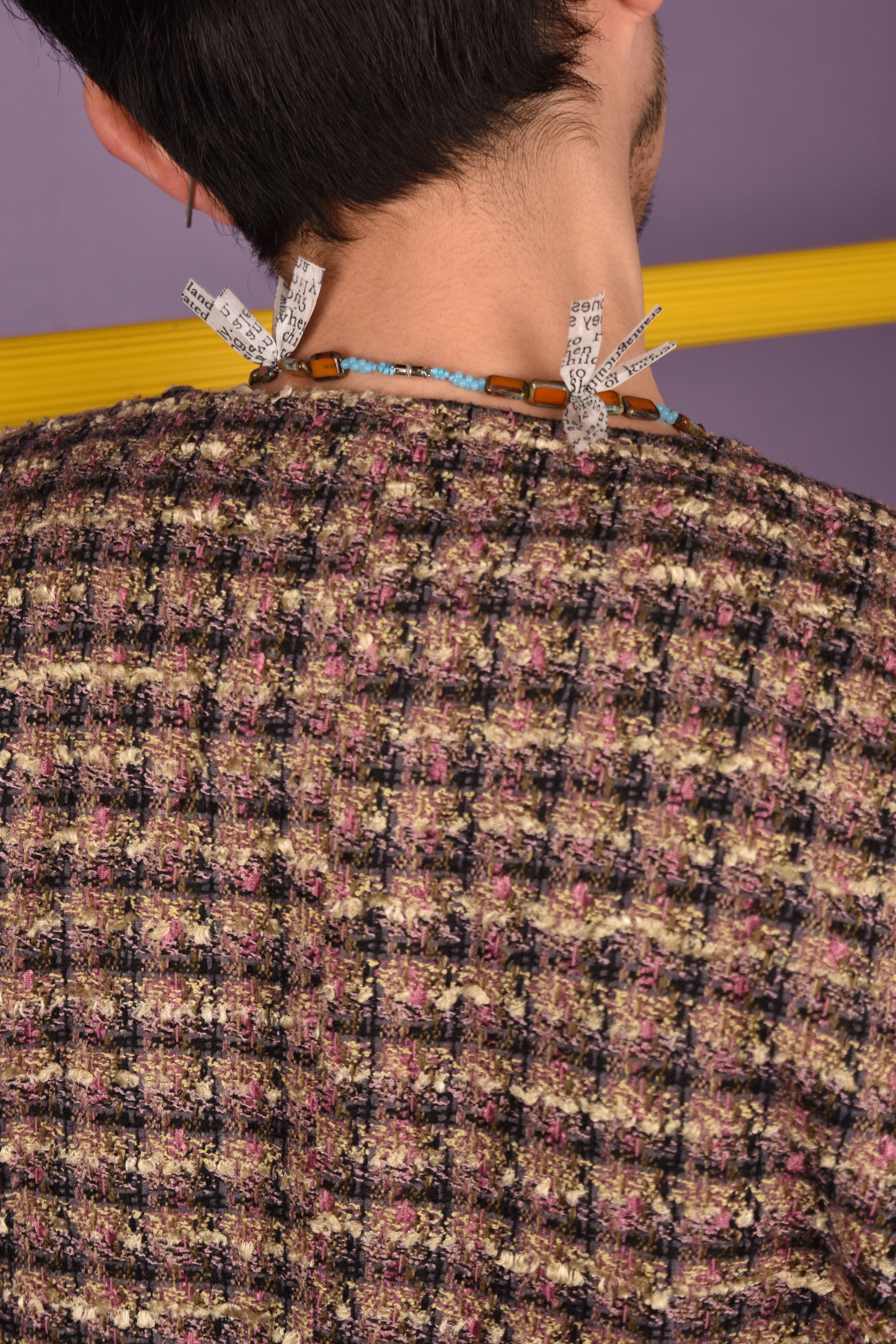 主にヨーロッパのアンティークガラスビーズを使用したネックレスです。モダンエスニックをテーマに製作し、鳥の羽の代わりにテキストプリントが入った不織布を使用しました。マグネット仕様なので脱着が容易です。ユニセックスとなります。貴重なビーズですので少量限定販売です。
