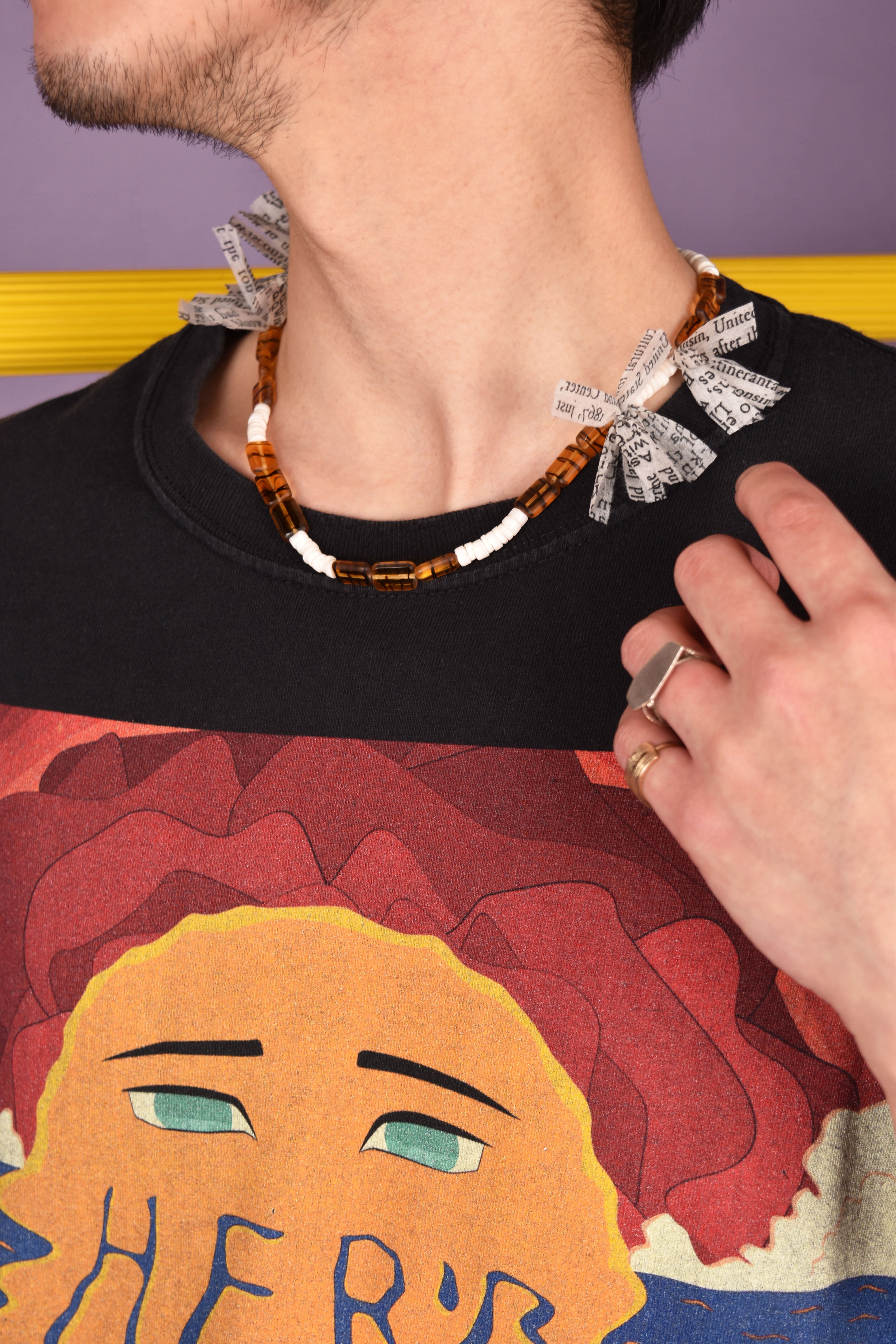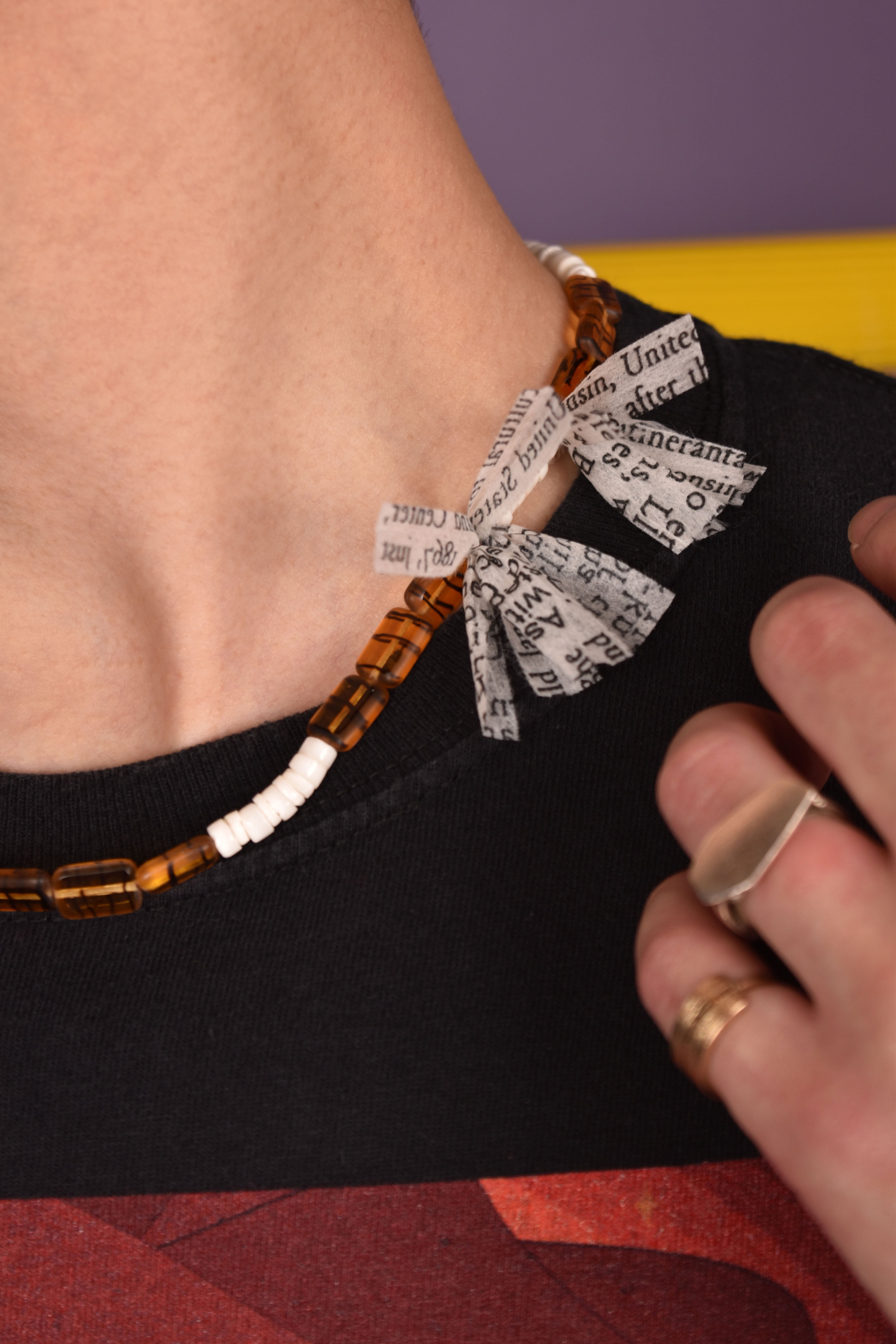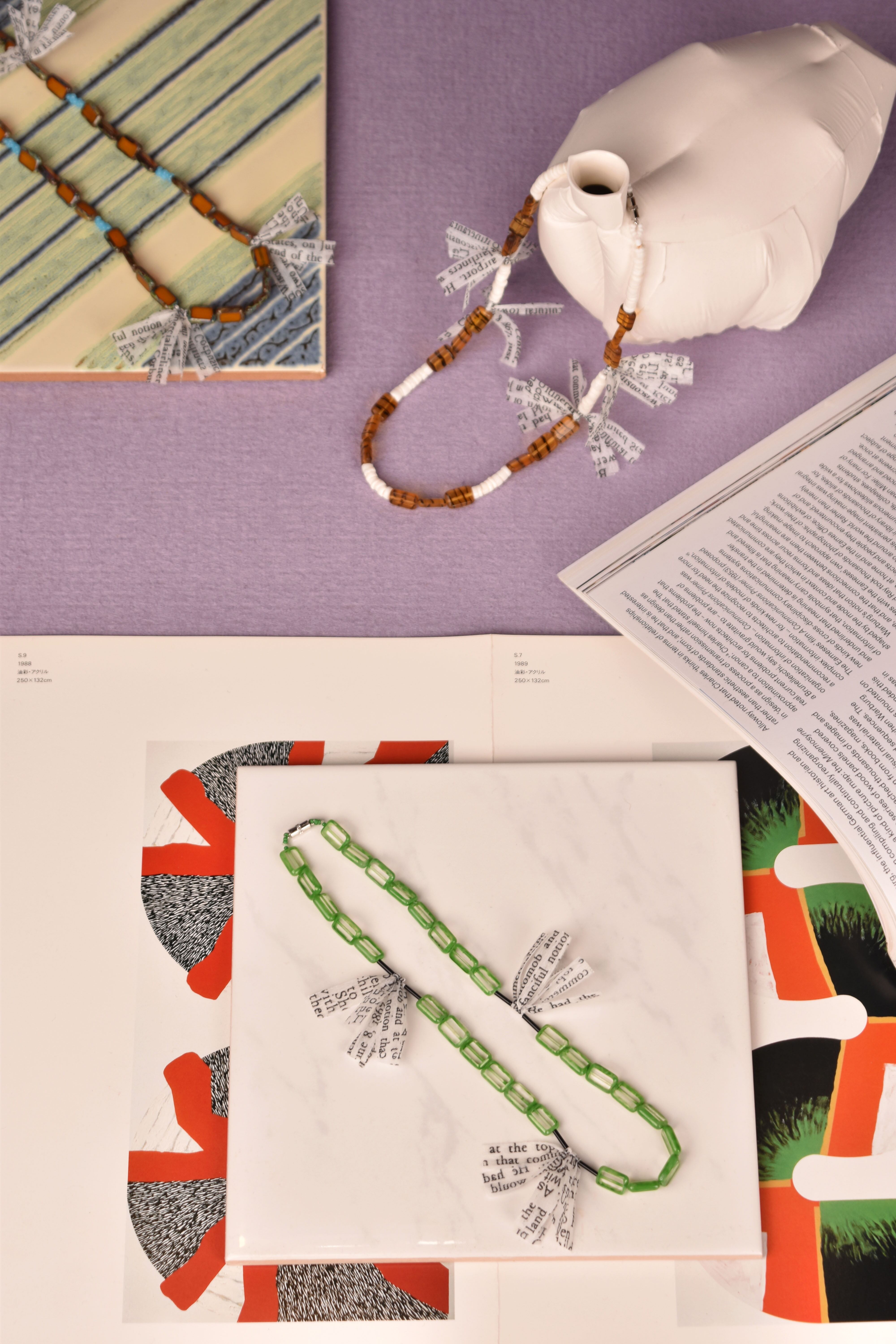 主にヨーロッパのアンティークガラスビーズを使用したネックレスです。モダンエスニックをテーマに製作し、鳥の羽の代わりにテキストプリントが入った不織布を使用しました。マグネット仕様なので脱着が容易です。ユニセックスとなります。貴重なビーズですので少量限定販売です。