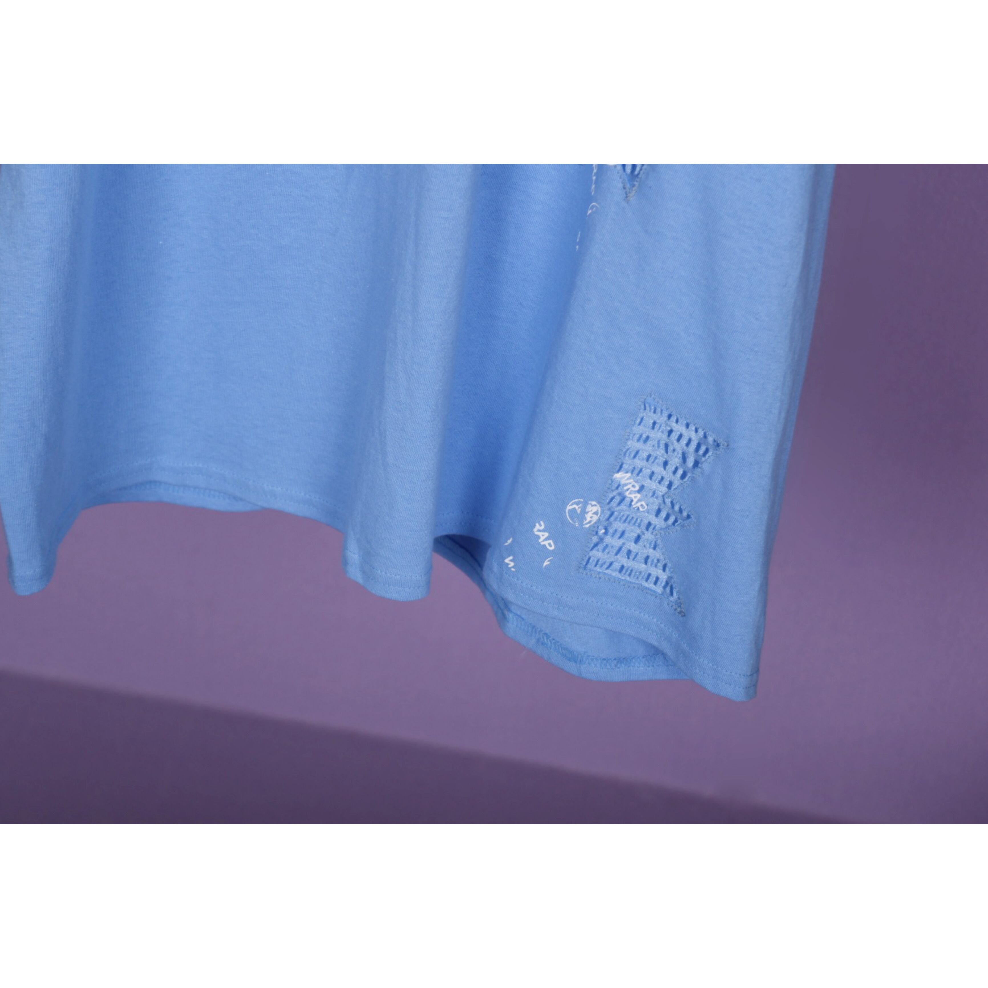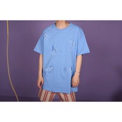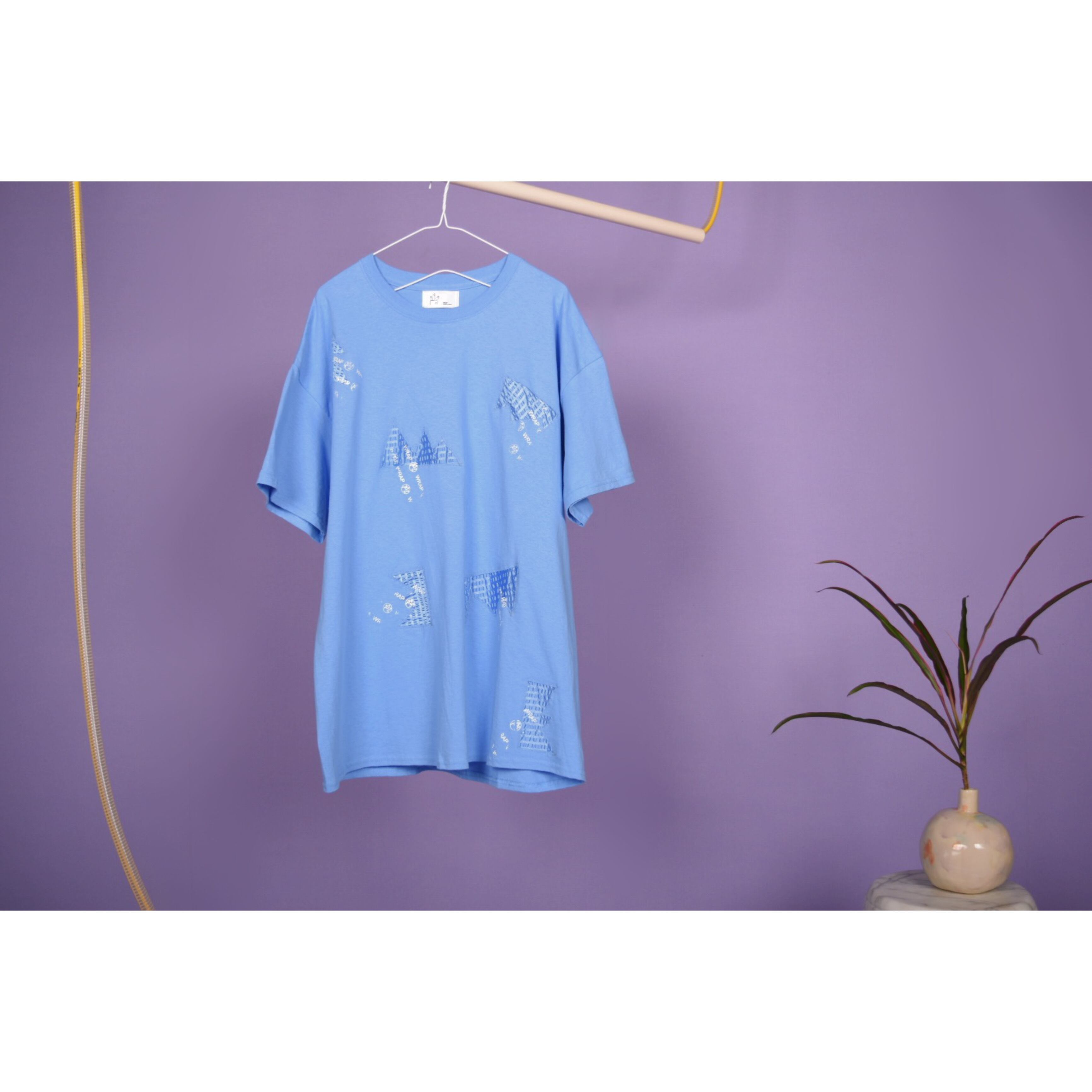 生地でデザインしたTEEです。テキスタイルの上にWRAPのロゴプリントが入っております。オーバーサイズで女性が着用しても可愛いです。ユニセックスです。