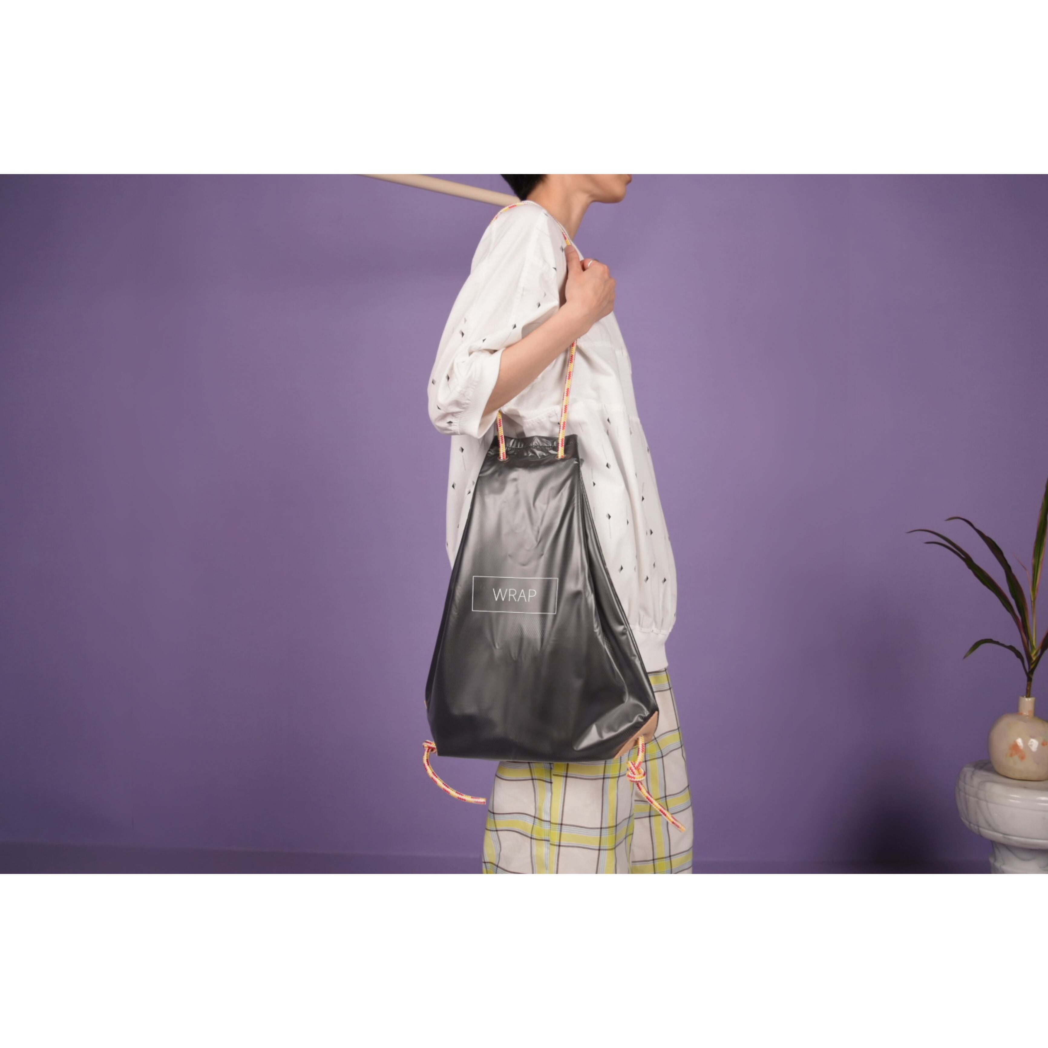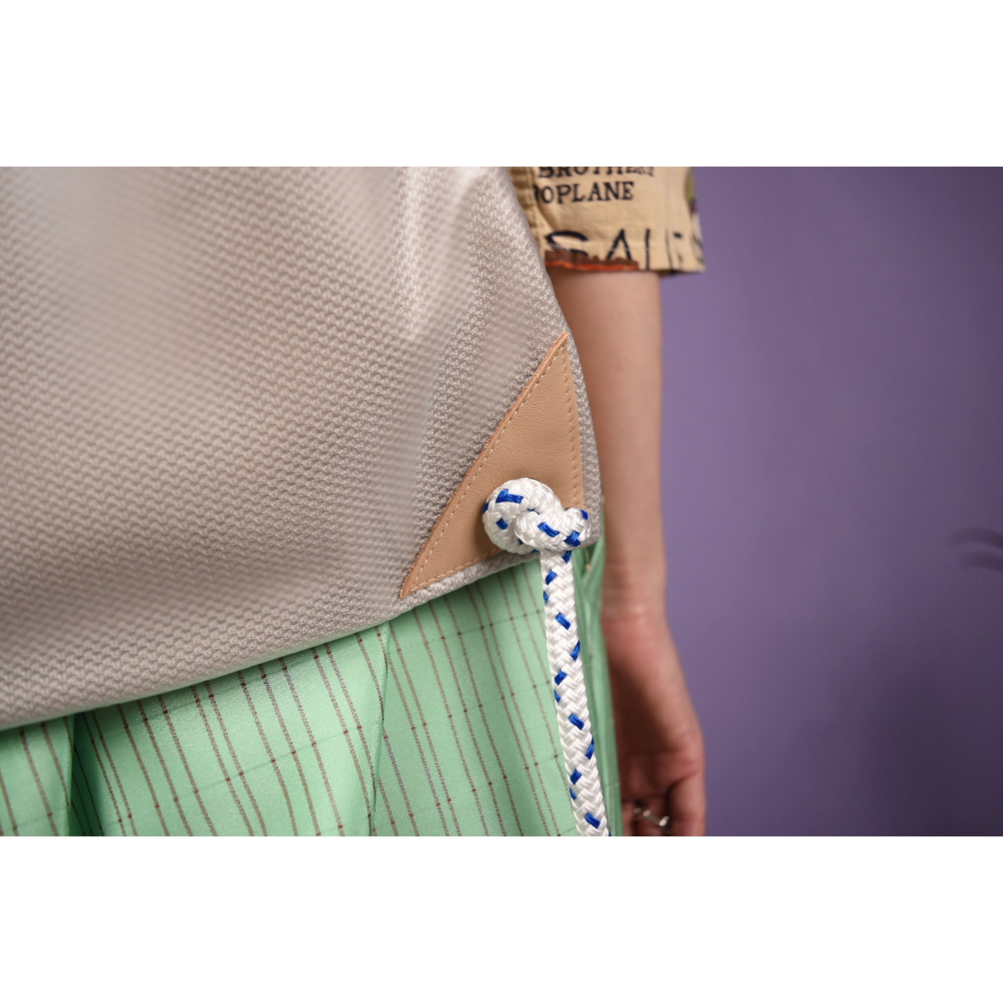 メッシュ生地と、梨地(PVC)、牛革を使用したナップサックです。日本ではあまりファッションに取り入れてる方を見かけませんがめちゃめちゃオシャレですよね。小学校で作るイメージから子供っぽいイメージがあるんですかね?両手開けたいけどリュックは暑い!という方、ぜひオススメです。写真9-10枚目のようにナップサックの裏上部2箇所のところで結び目を作って、フロントのロープを引っ張ると、ナップサックからショルダーバッグに形を変えます。梨地は撥水性もあるので雨の日も安心して使用できます。中にポケットをつけているので便利です。