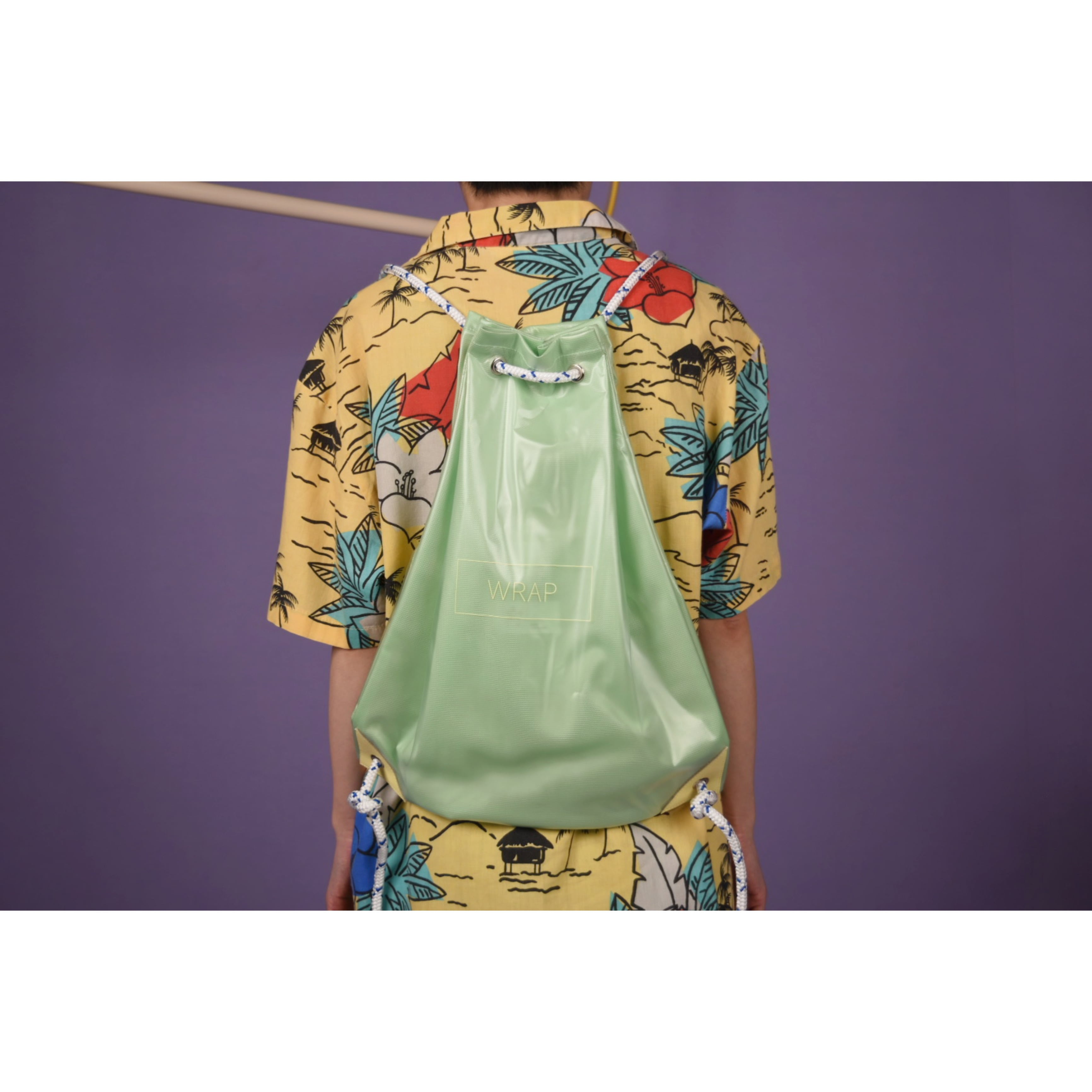 メッシュ生地と、梨地(PVC)、牛革を使用したナップサックです。日本ではあまりファッションに取り入れてる方を見かけませんがめちゃめちゃオシャレですよね。小学校で作るイメージから子供っぽいイメージがあるんですかね?両手開けたいけどリュックは暑い!という方、ぜひオススメです。写真7-8枚目のようにナップサックの裏上部2箇所のところで結び目を作って、フロントのロープを引っ張ると、ナップサックからショルダーバッグに形を変えます。梨地は撥水性もあるので雨の日も安心して使用できます。中にポケットをつけているので便利です。