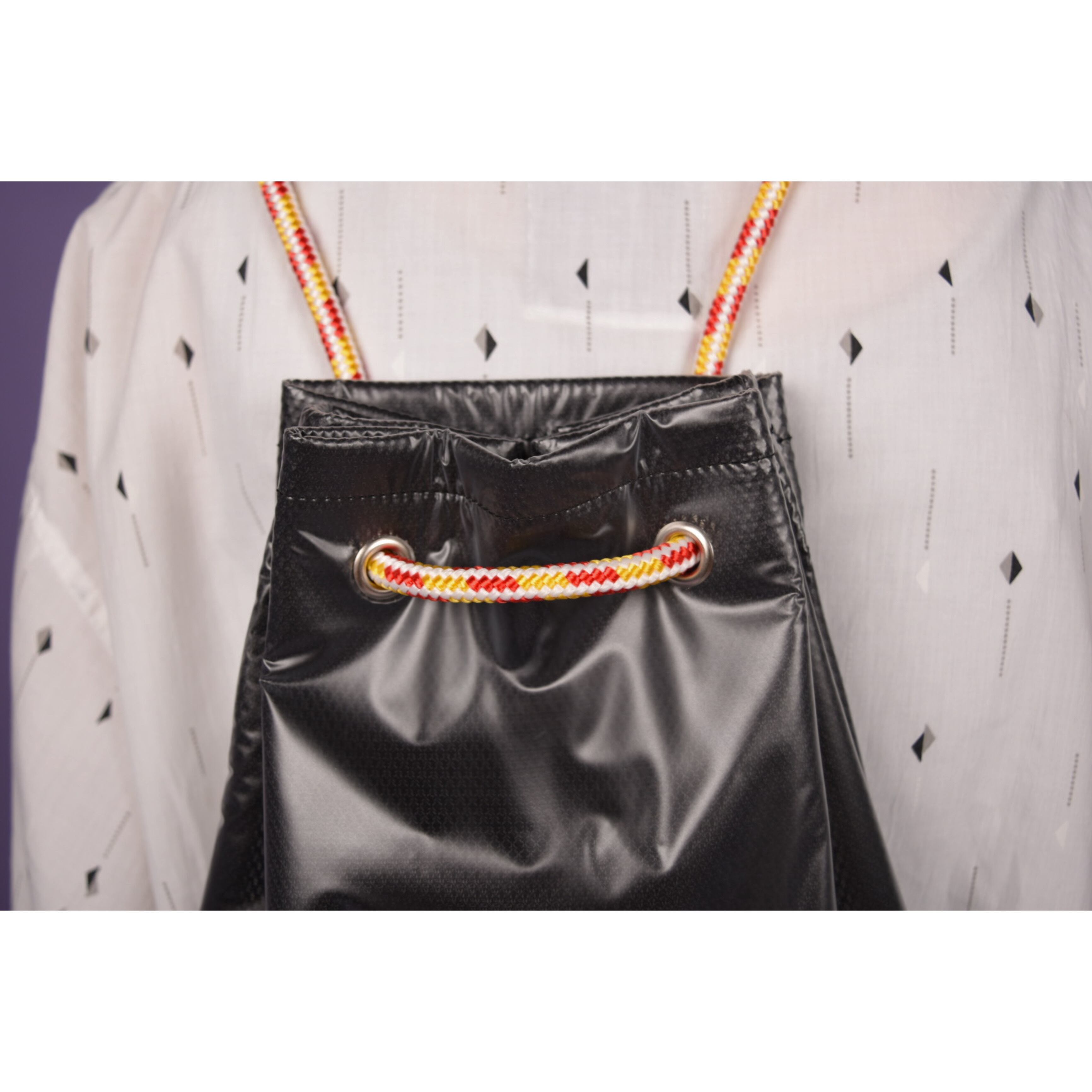 メッシュ生地と、梨地(PVC)、牛革を使用したナップサックです。日本ではあまりファッションに取り入れてる方を見かけませんがめちゃめちゃオシャレですよね。小学校で作るイメージから子供っぽいイメージがあるんですかね?両手開けたいけどリュックは暑い!という方、ぜひオススメです。写真7-8枚目のようにナップサックの裏上部2箇所のところで結び目を作って、フロントのロープを引っ張ると、ナップサックからショルダーバッグに形を変えます。梨地は撥水性もあるので雨の日も安心して使用できます。中にポケットをつけているので便利です。