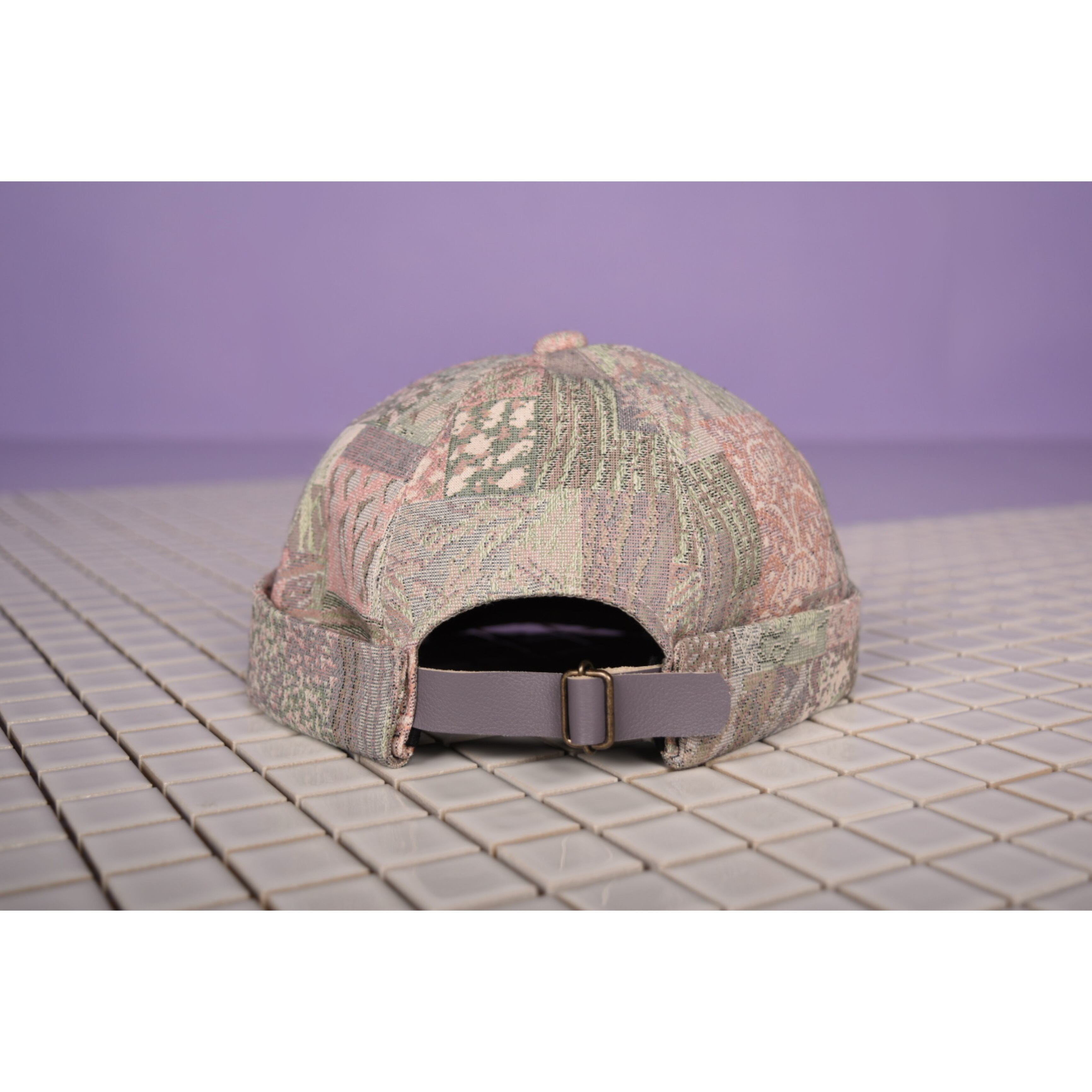 オリジナルパターンでフィッシャーマンキャップを製作しました。こちらは抽象的なパターンが面白いゴブラン織の生地を使用しております。レザー製のアジャスターでサイズ調整も可能なのでユニセックスで着用できます。