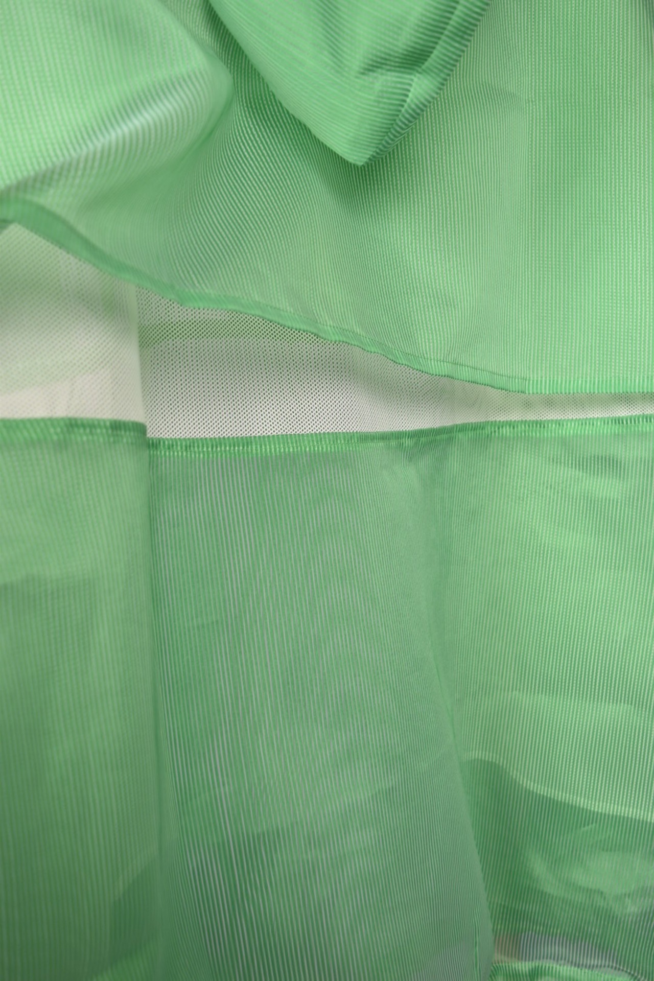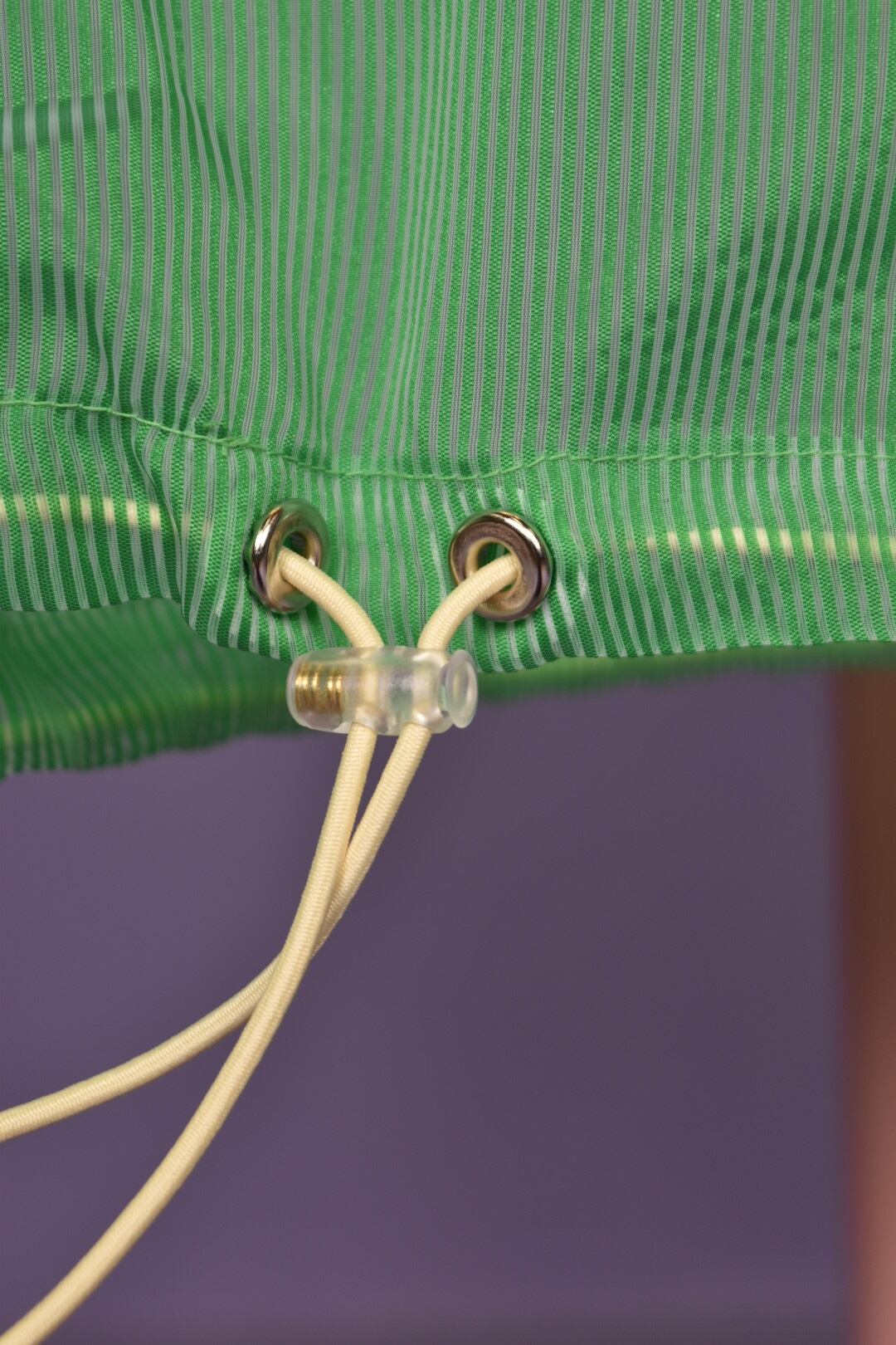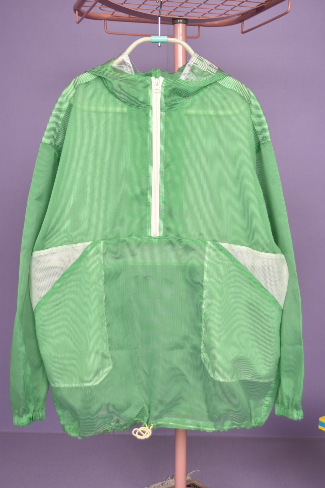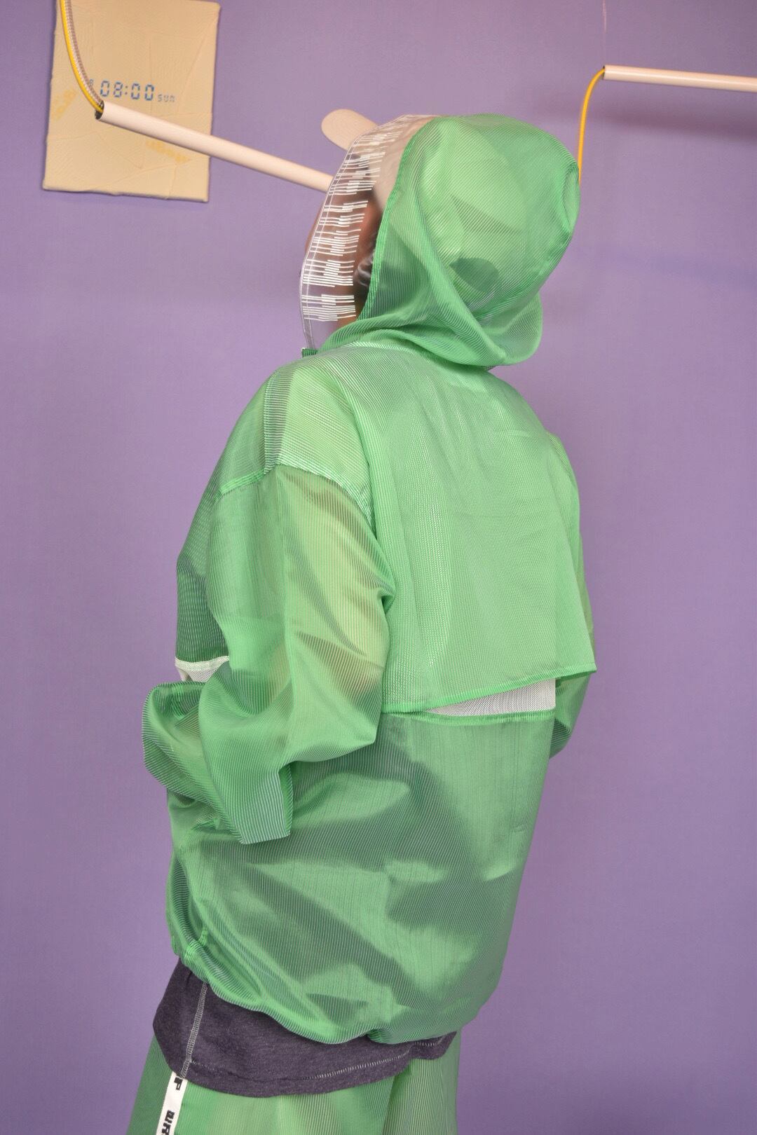 シースルーのストライプ地を使用したアノラックパーカーです。ポケット、背中にメッシュ素材を使いアクセントに。裾はゴム紐で絞れます。フードの入り口はPVCを使用し、プリントデザインを入れております。(経年変化で取れる可能性あり。)