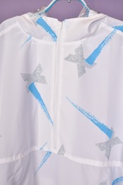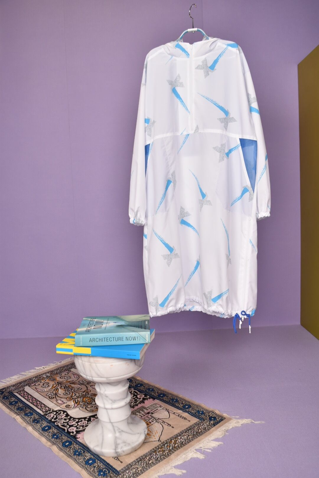 柄のデザインがポイントのアノラックコート。ポケット、背中にメッシュ素材を使いアクセントに。裾は紐で絞れます。ジッパーでスリットを開けられるのでスタイリングに合わせて調節できます。フードの入り口はPVCを使用し、プリントデザインを入れております。(経年変化で取れる可能性あり。)撥水ではないのでレインコートとしては使用できませんが、撥水スプレーをかけて雨天に着ても可愛いかも。