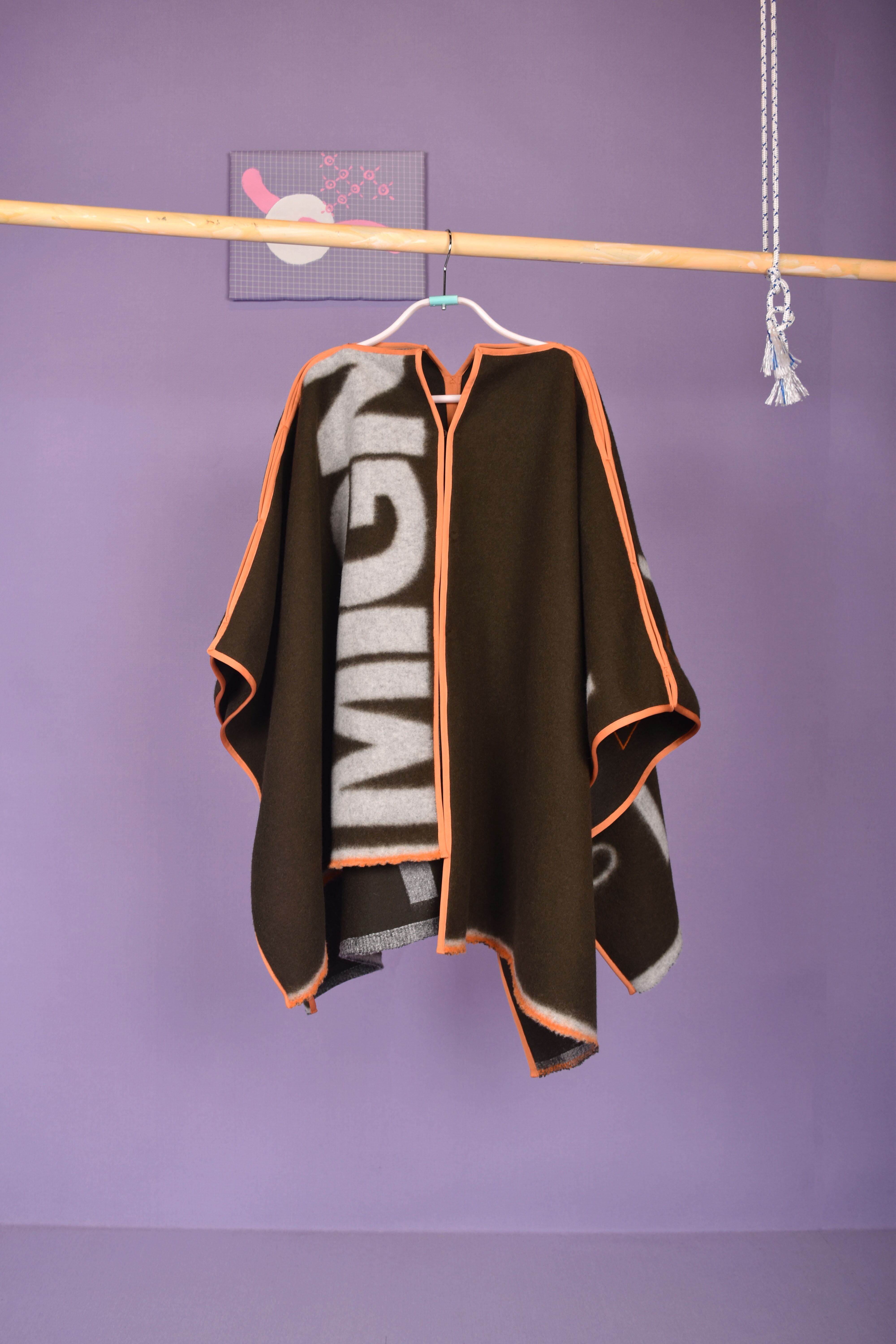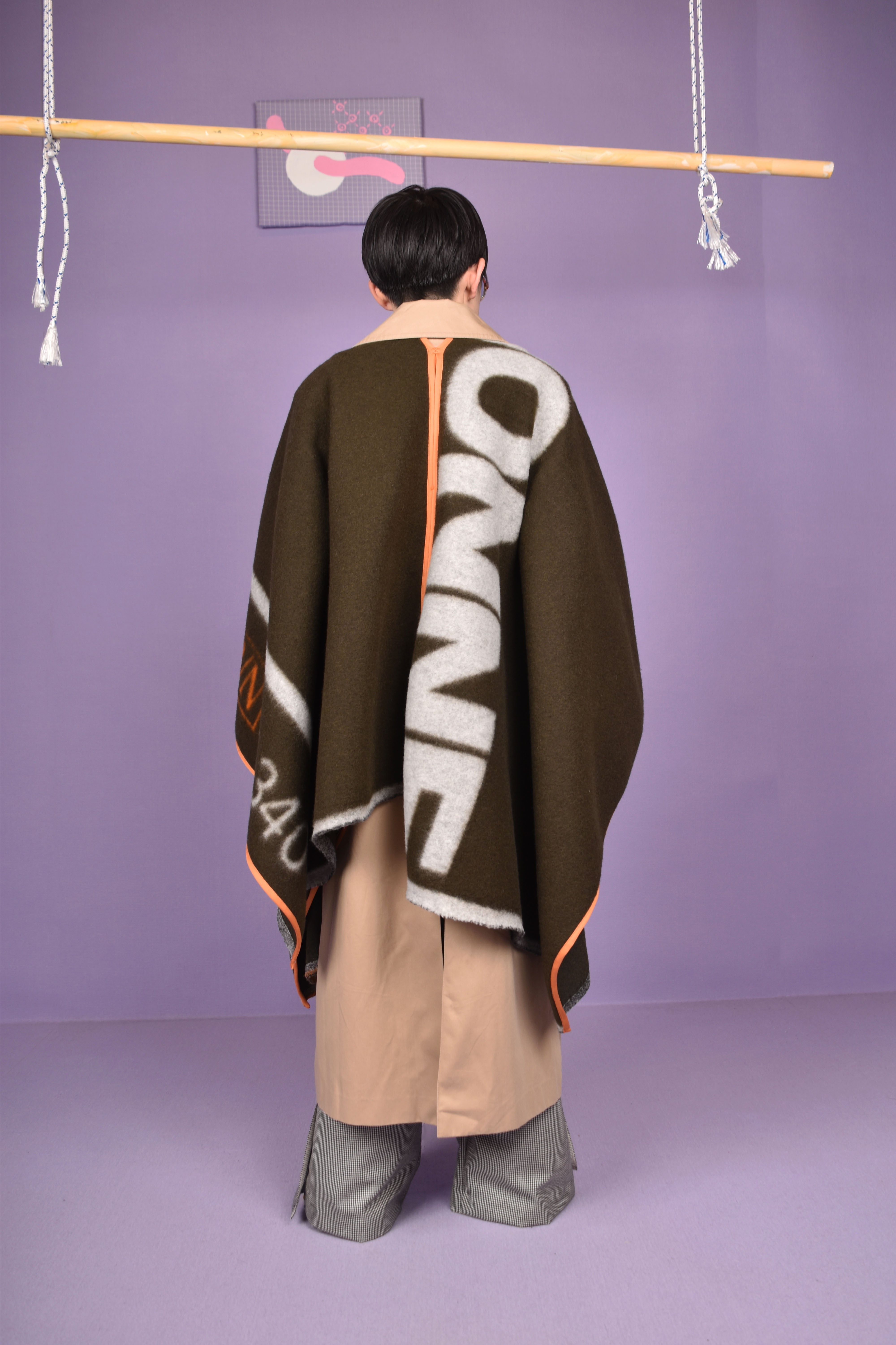 made in Italyのブランケット生地を使用したポンチョです。フロントはフックが3つ付いてありコーディネートに合わせた着用が可能です。前後逆で着るのもお勧めです。非常に軽く、ウール混で保温性も高いためこの時季にとても便利です。ユニセックスです。