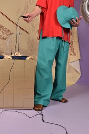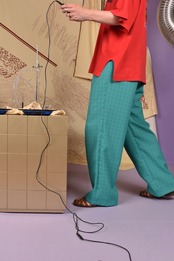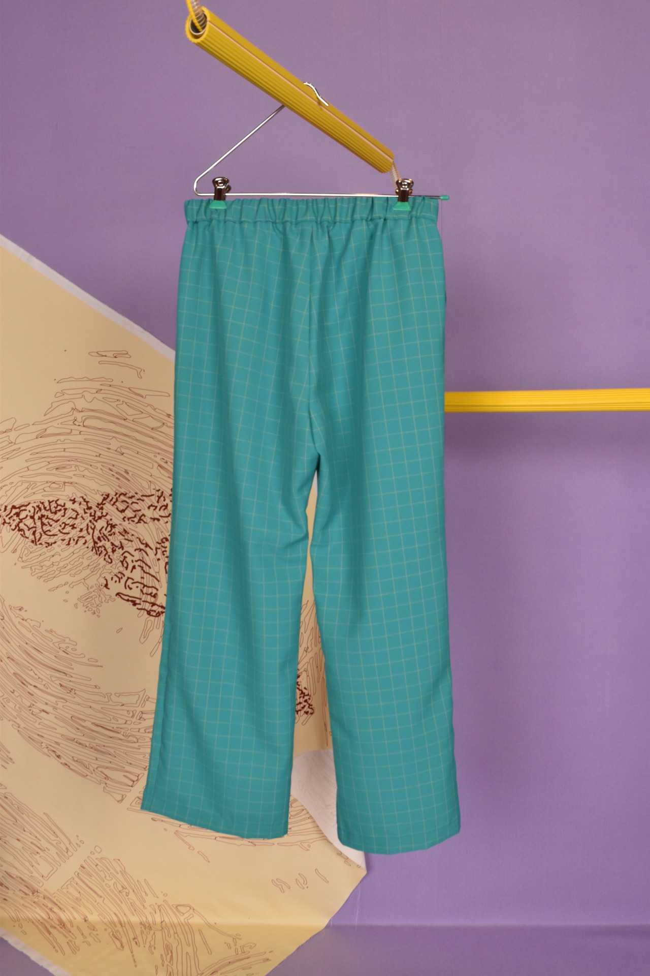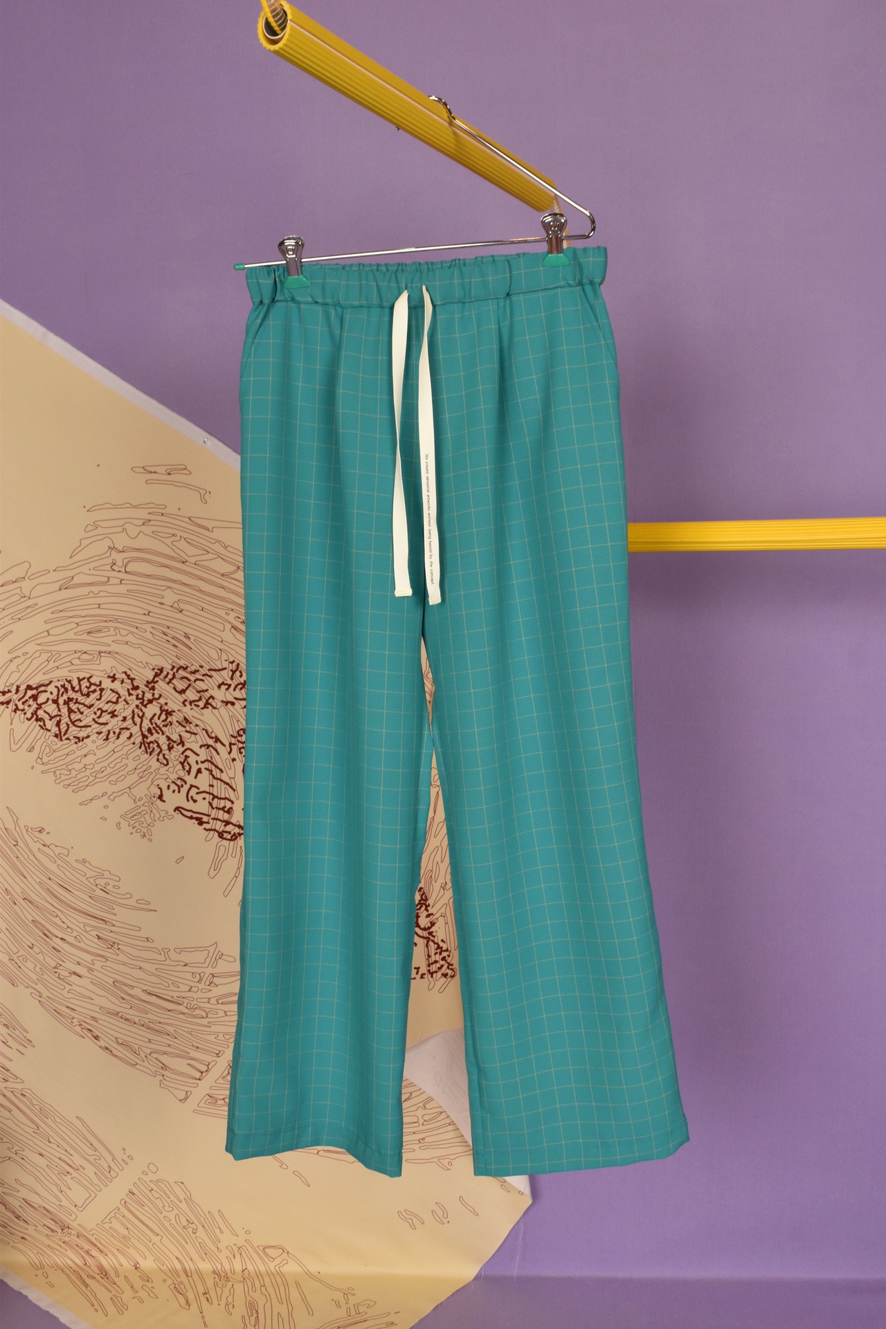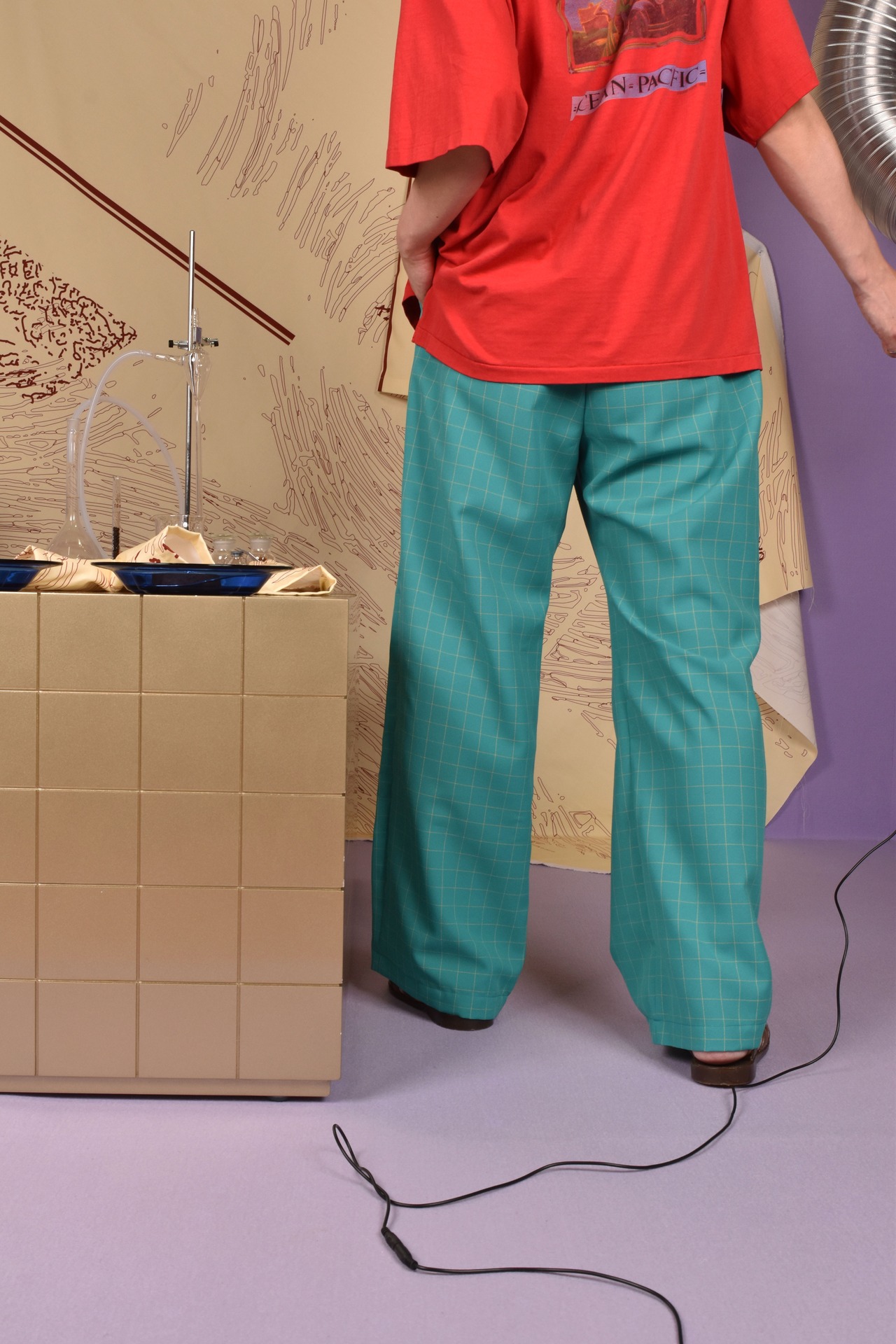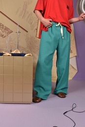 グリーンにイエローの細いグラフチェックがナイスカラーなイージーパンツです。両サイドにシームポケットがあります。ウエストは紐で絞り調整が可能なためユニセックスで着用可能です。オールシーズン着用頂けます!